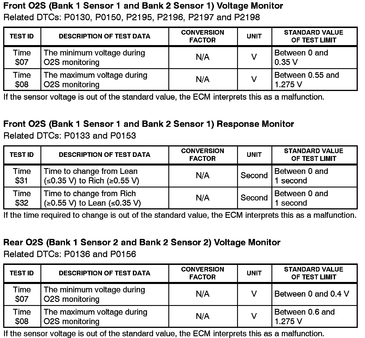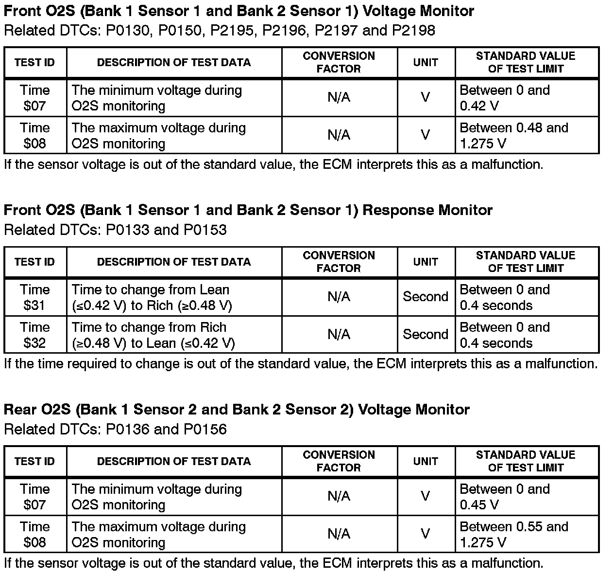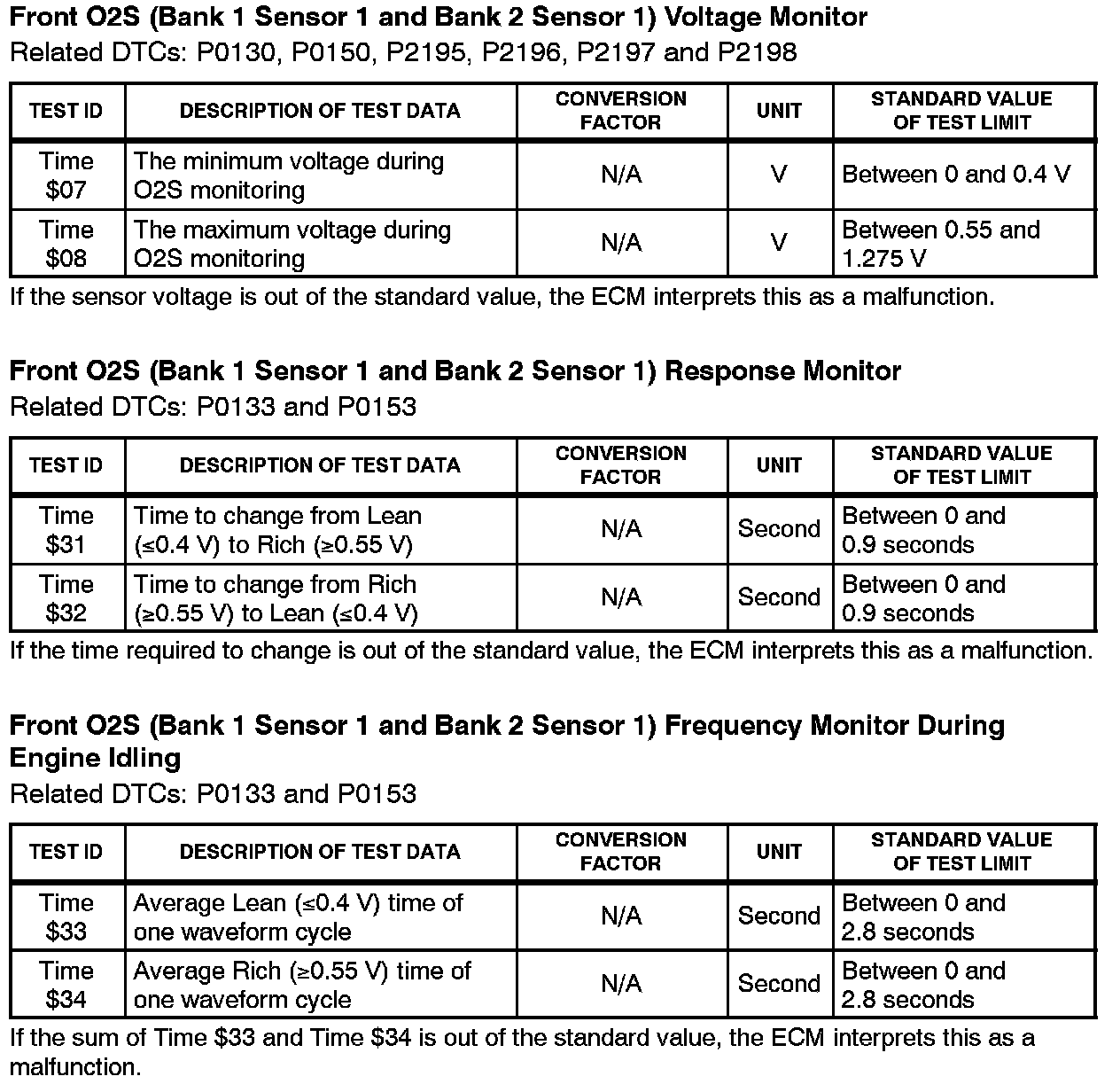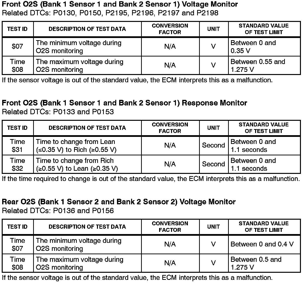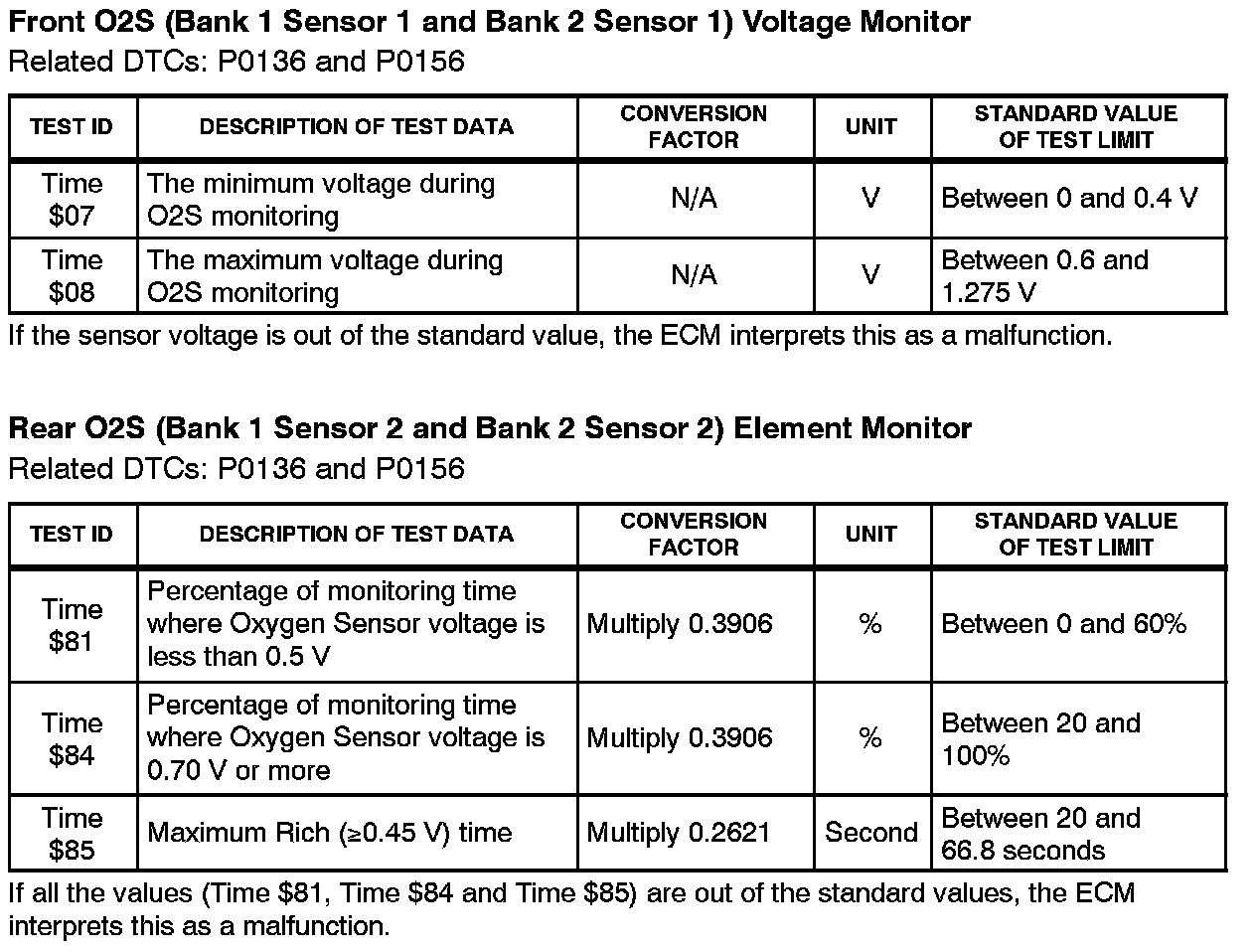 This Service Bulletin contains Oxygen Sensor (O2S) Monitor threshold values for all models from 1996 to 2003 and some 2004 models. Starting in 2004, the O2S Monitor threshold values can be found in the repair manual. These values are used when analyzing the O2S test results to determine the O2S condition.