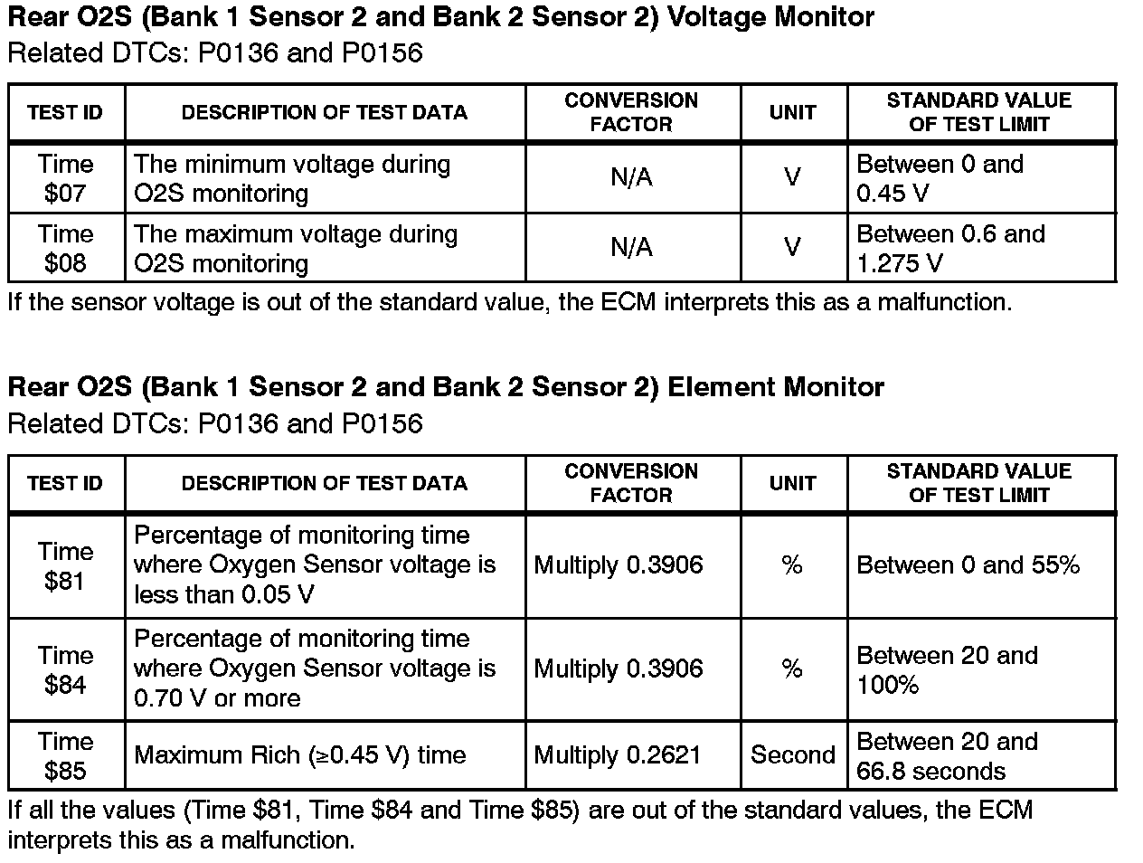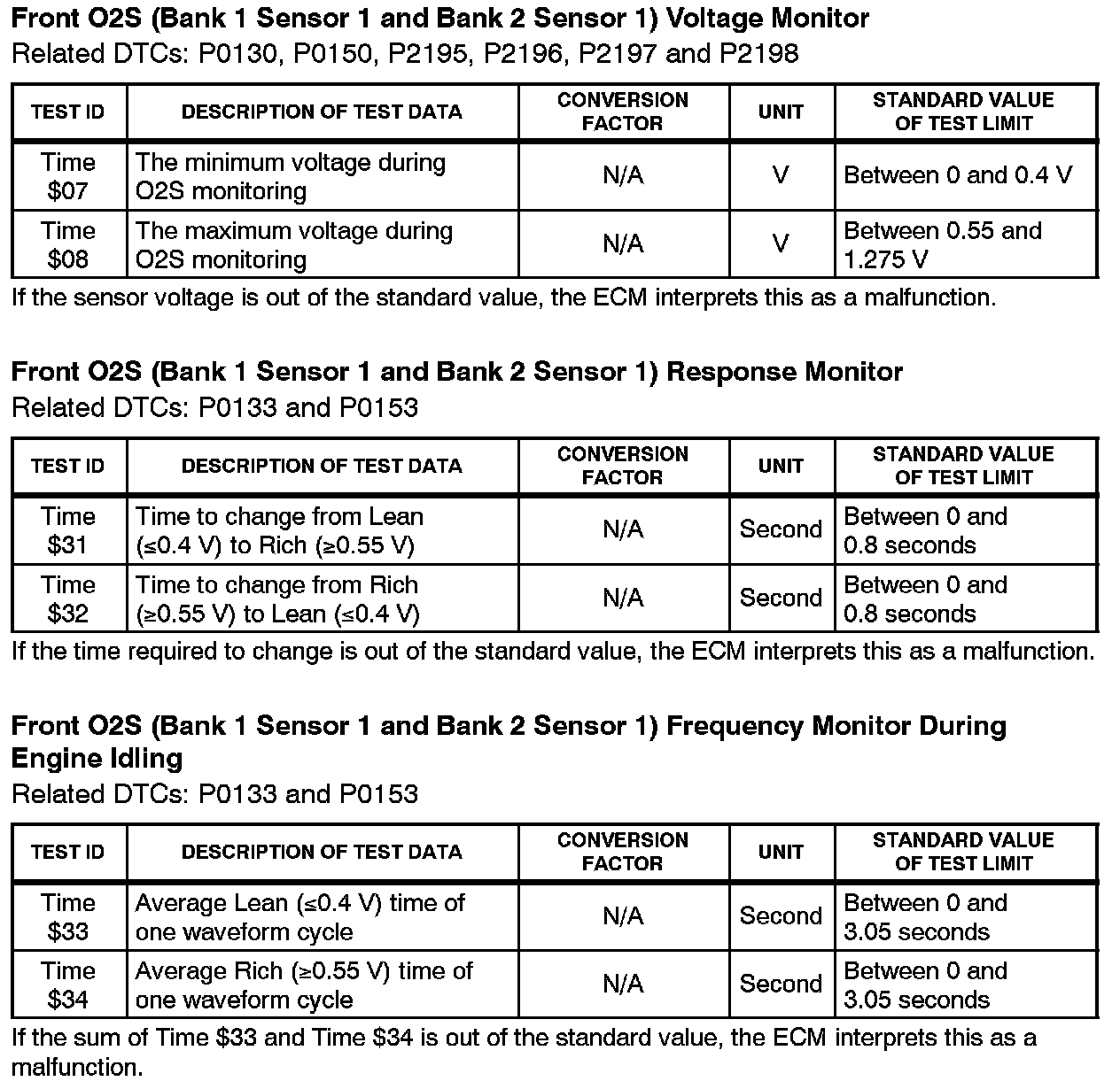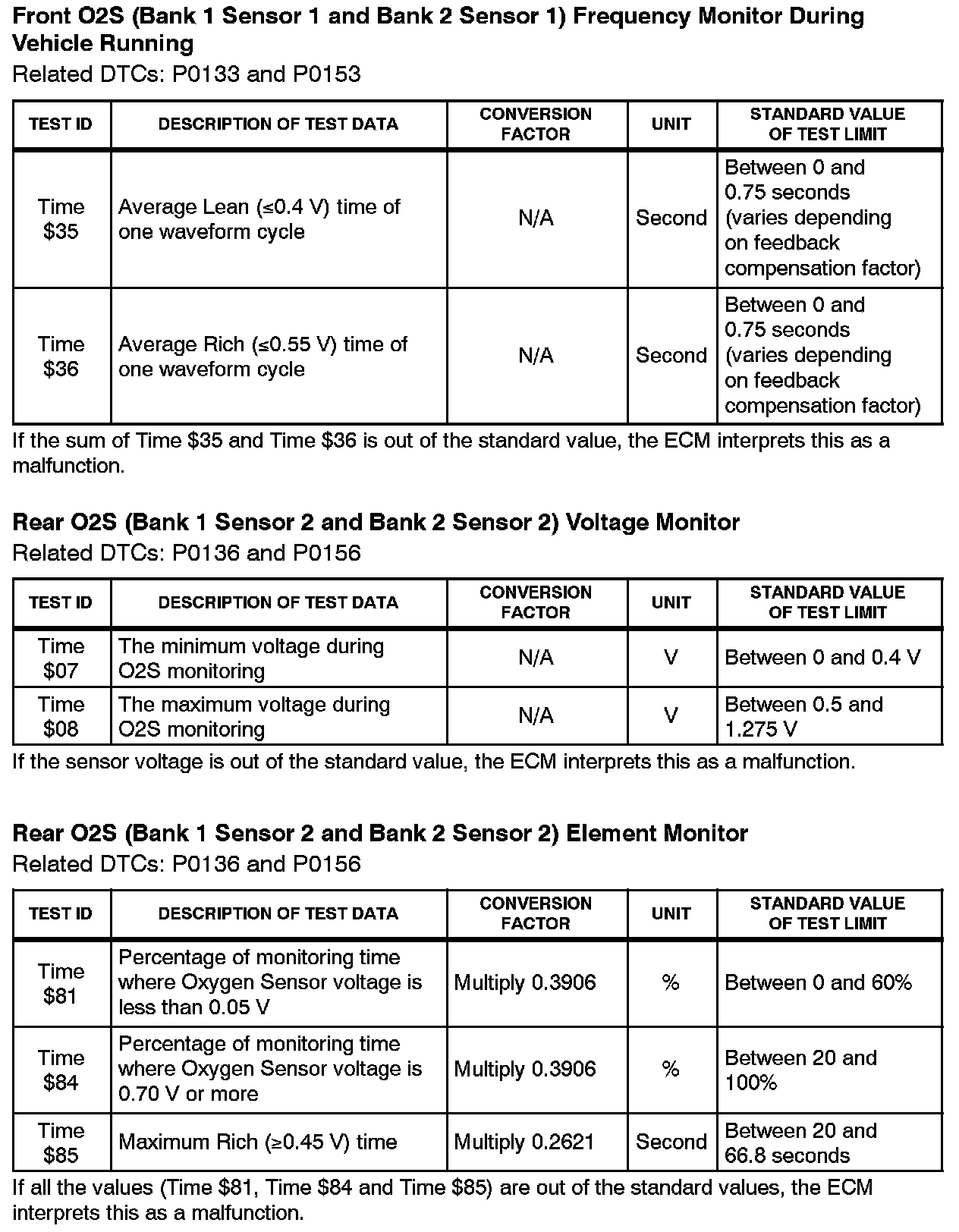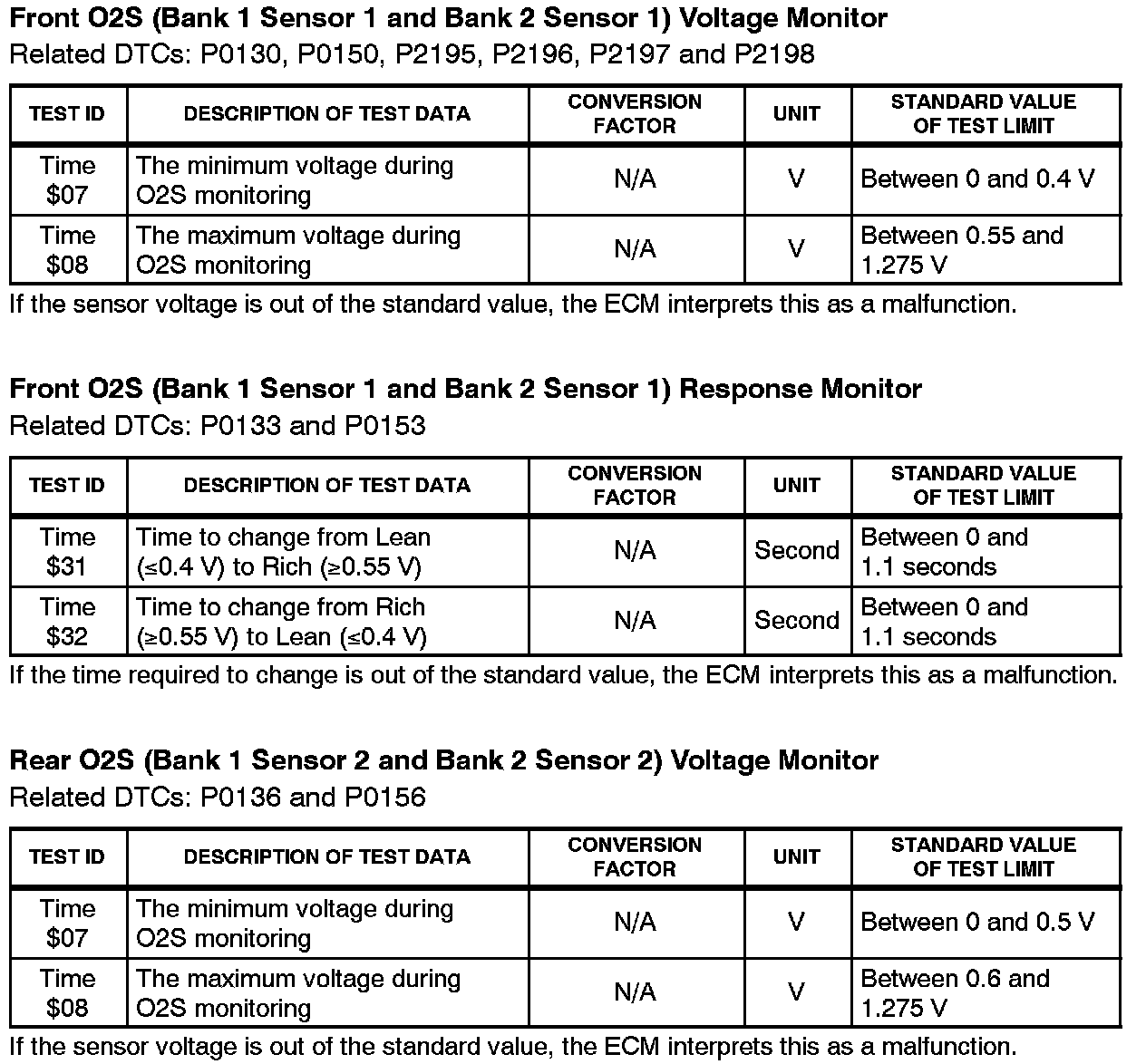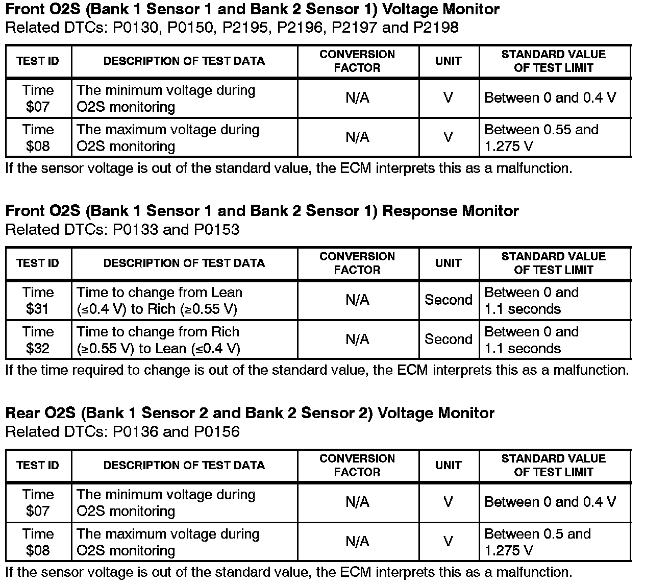 This Service Bulletin contains Oxygen Sensor (O2S) Monitor threshold values for all models from 1996 to 2003 and some 2004 models. Starting in 2004, the O2S Monitor threshold values can be found in the repair manual. These values are used when analyzing the O2S test results to determine the O2S condition.