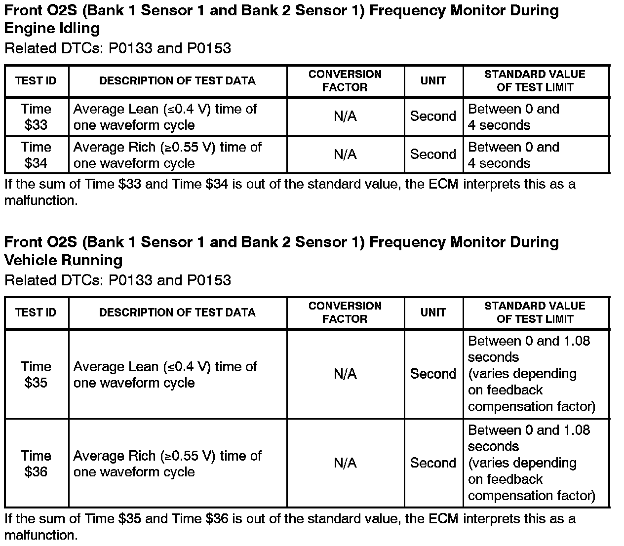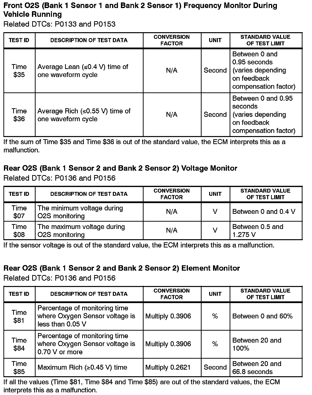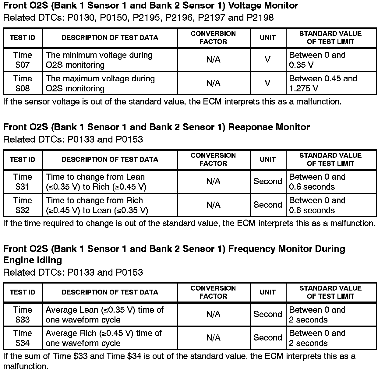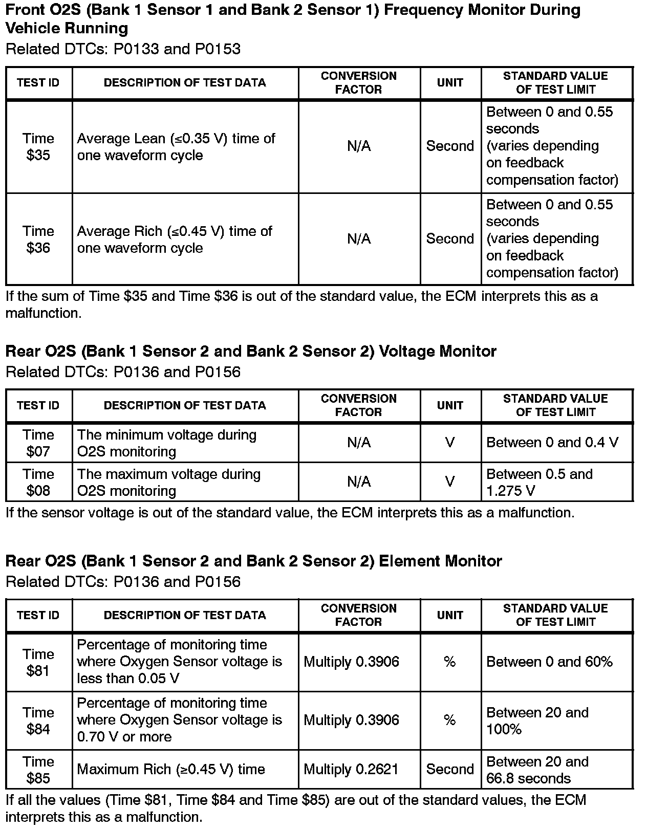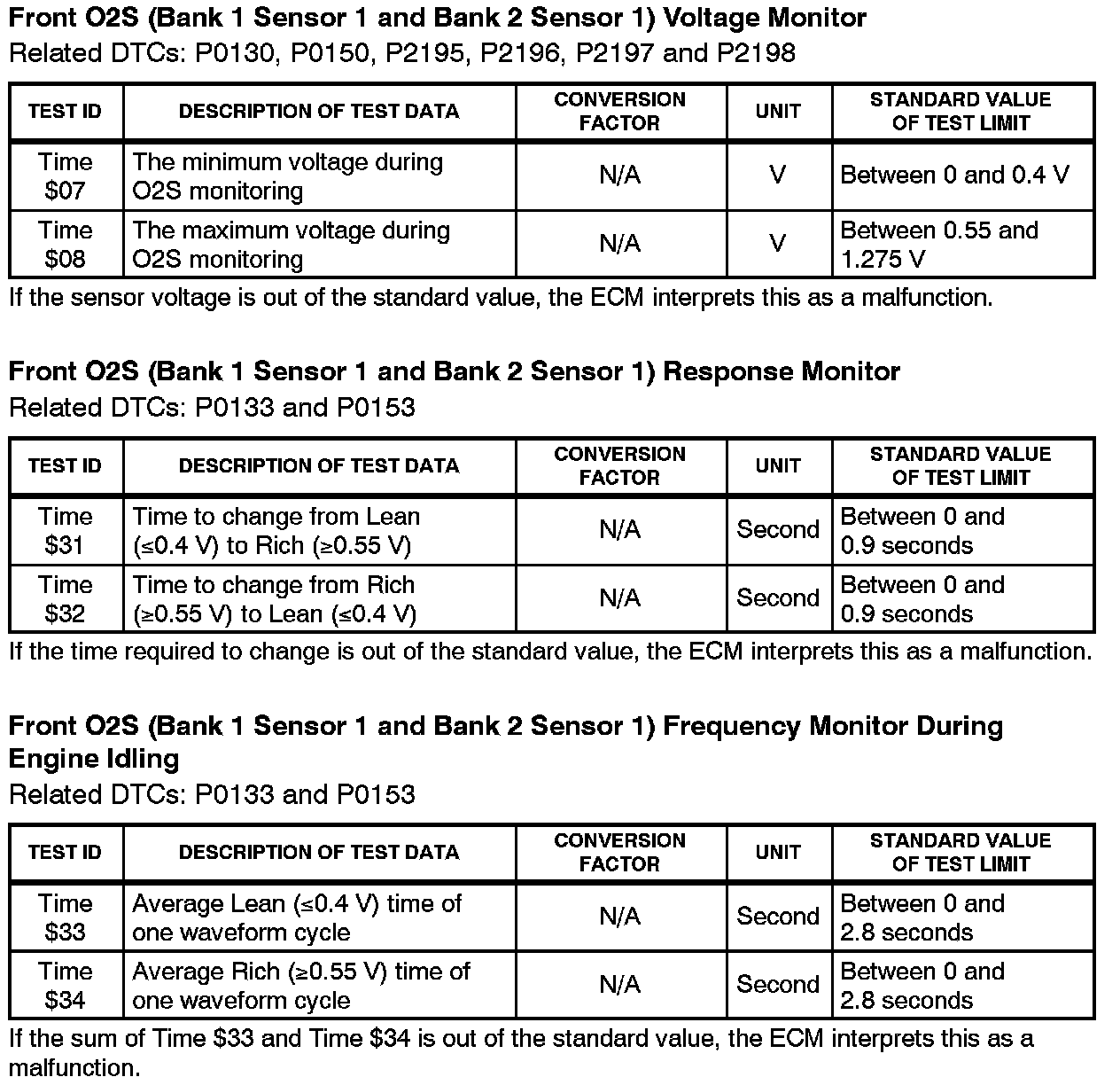 This Service Bulletin contains Oxygen Sensor (O2S) Monitor threshold values for all models from 1996 to 2003 and some 2004 models. Starting in 2004, the O2S Monitor threshold values can be found in the repair manual. These values are used when analyzing the O2S test results to determine the O2S condition.