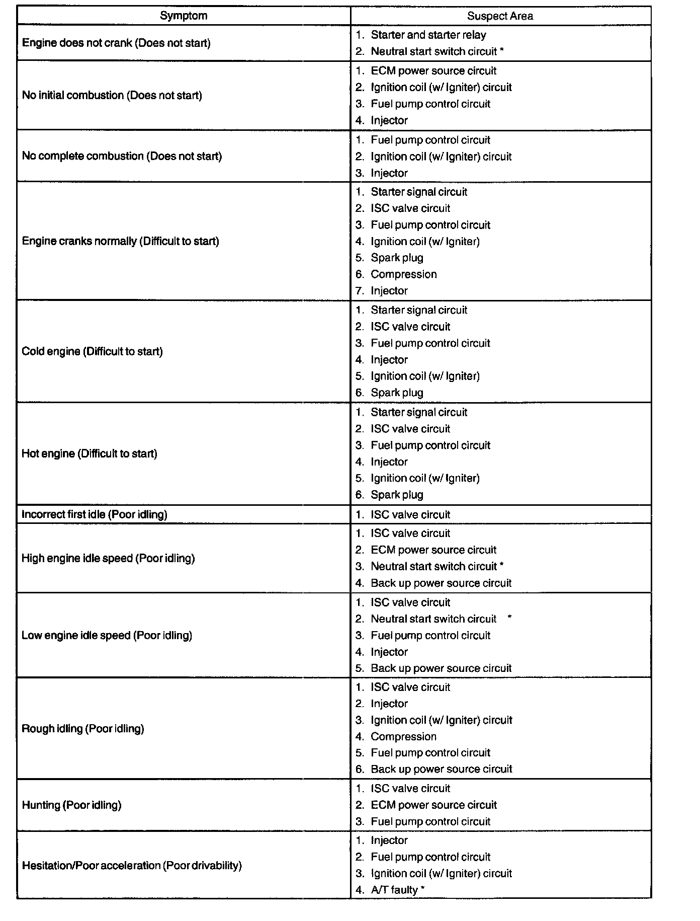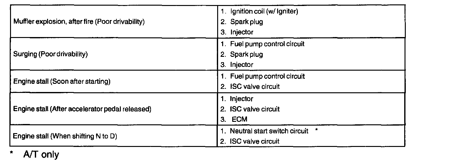 When the malfunction code is not confirmed in the diagnostic trouble code check and the problem still can not be confirmed in the basic inspection, proceed to this problem symptoms tables and troubleshoot according to the numbered order.
