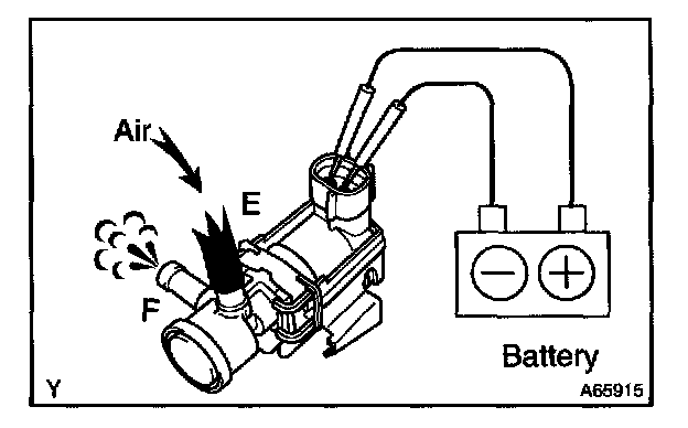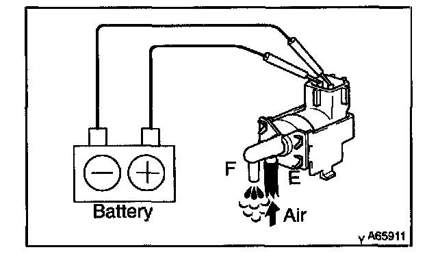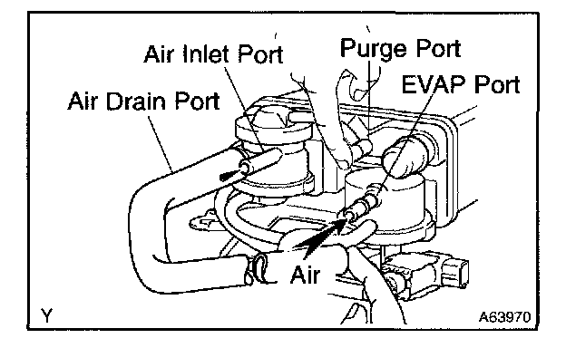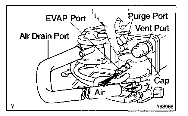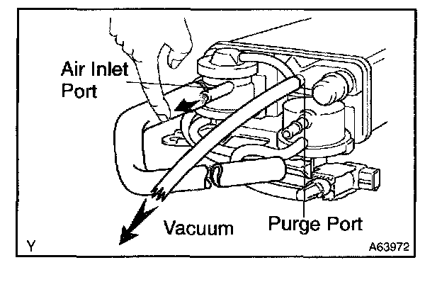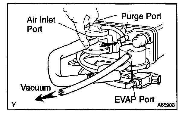 5. While holding the air inlet port closed, apply vacuum (3.43 kPa, 25.7 mmHg, 1.01 in.Hg) to the EVAP port and check that air flows into the purge port.