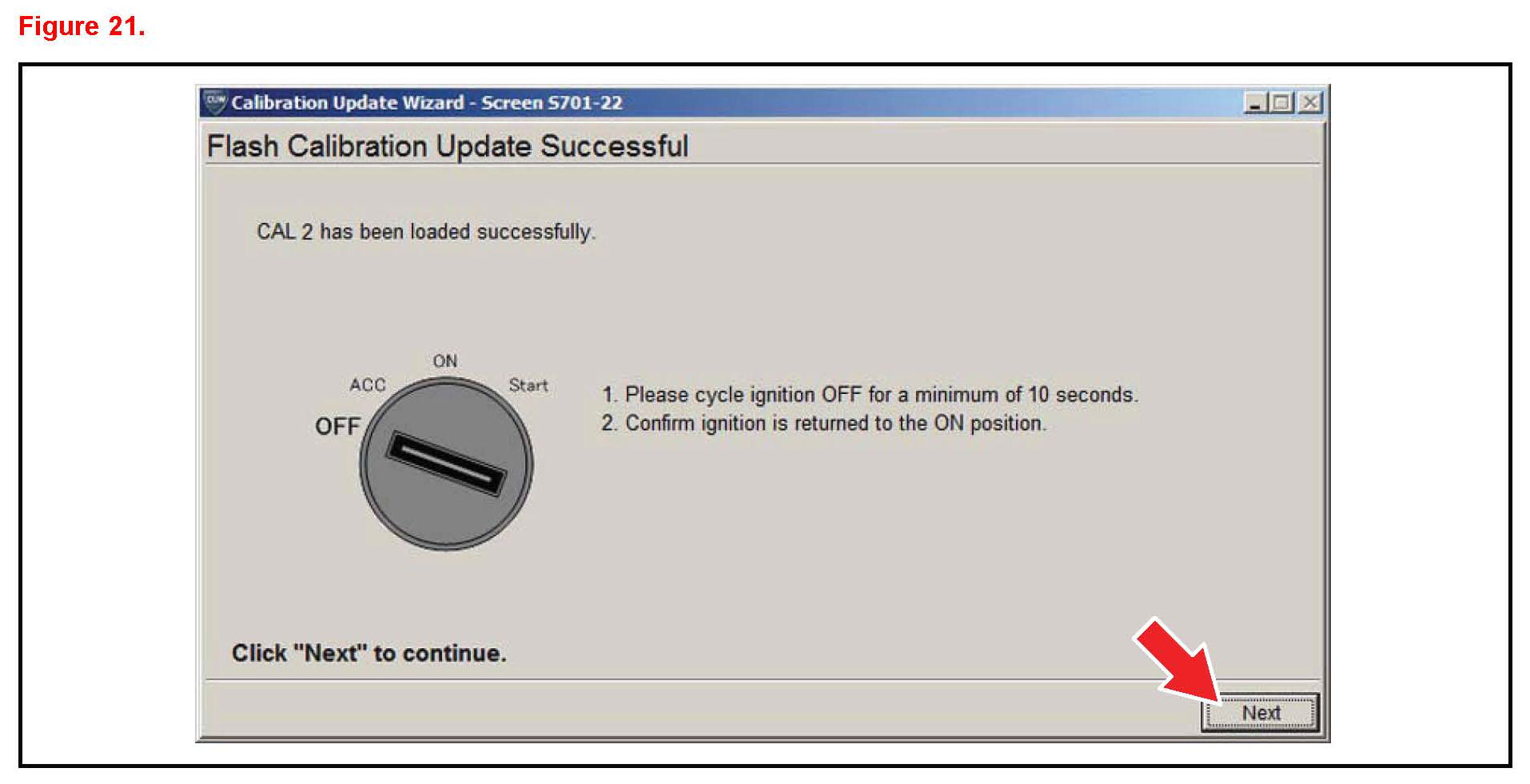 J. When Cal 1 has completed the update process turn ignition OFF for a minimum of 10 seconds. Then click "Next".