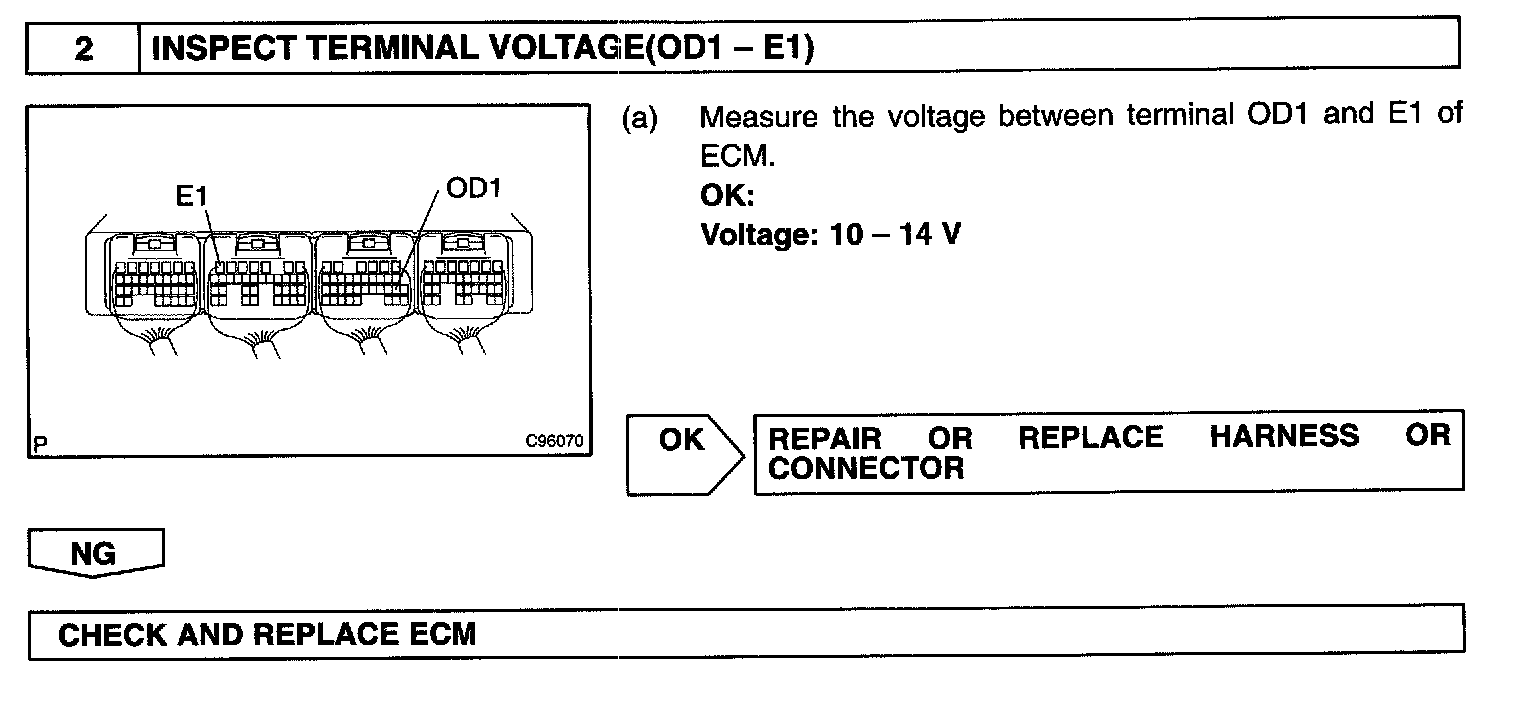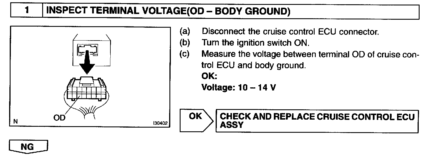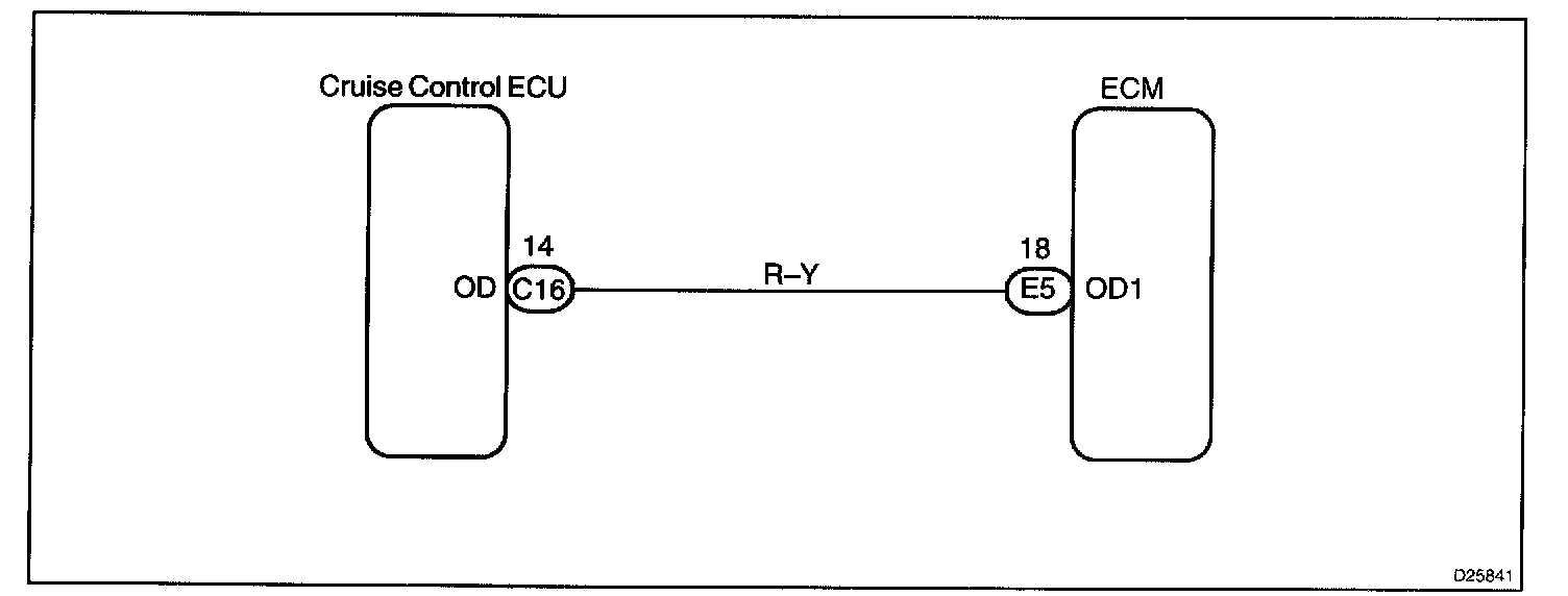 The cruise control ECU sends O/D cut signals to the ECM as necessary and the ECM cancels overdrive shifting until these signals are discontinued.