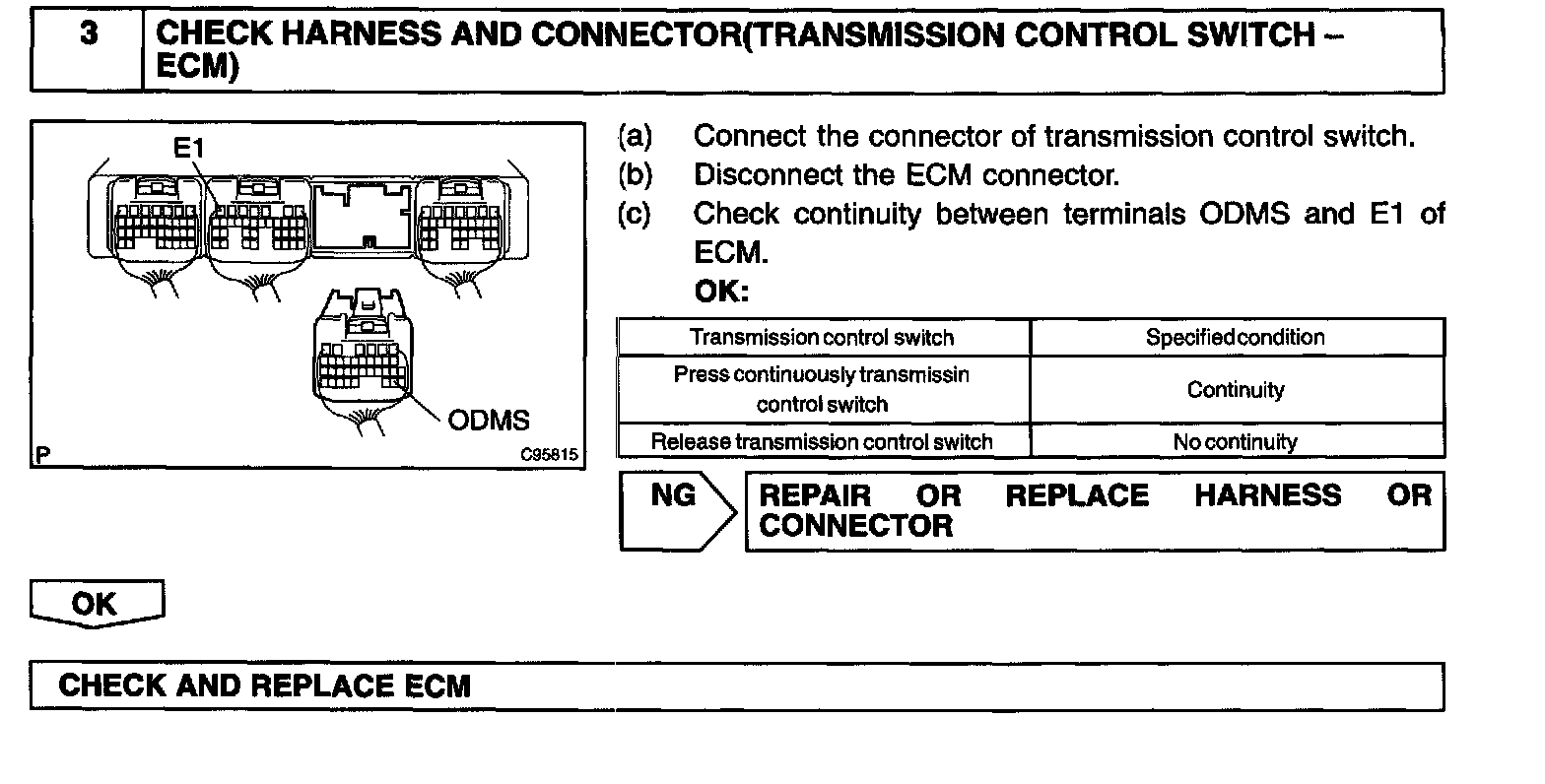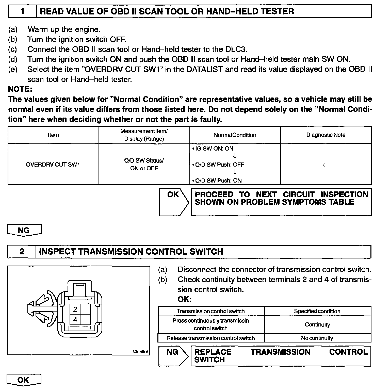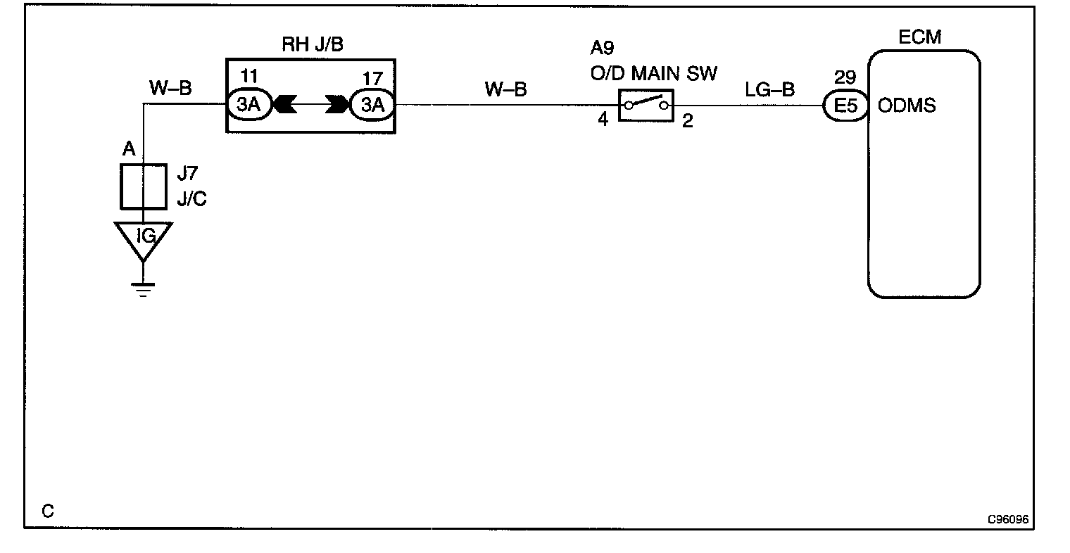 The O/D main switch is a momentary type switch. When pressing the O/D main switch, the O/D OFF indicator light lights up and the ECM prohibits shifting into O/D, and when pressing it once again, the O/D OFF indicator light goes off and the ECM allows shifting into O/D. Turning the IG switch OFF will reset the O/D OFF indicator light.
