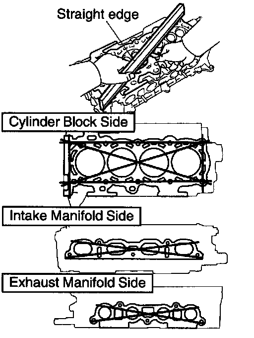 a. Using a precision straight edge and a feeler gauge, measure the surface contacting the cylinder block and the manifolds for warpage.
