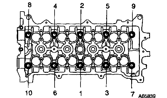 b. Using a 10 mm bi-hexagon wrench, install and uniformly tighten the 10 cylinder head bolts with plate washers, in several passes, in the sequence shown.
