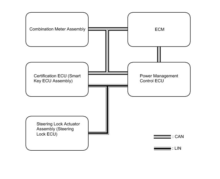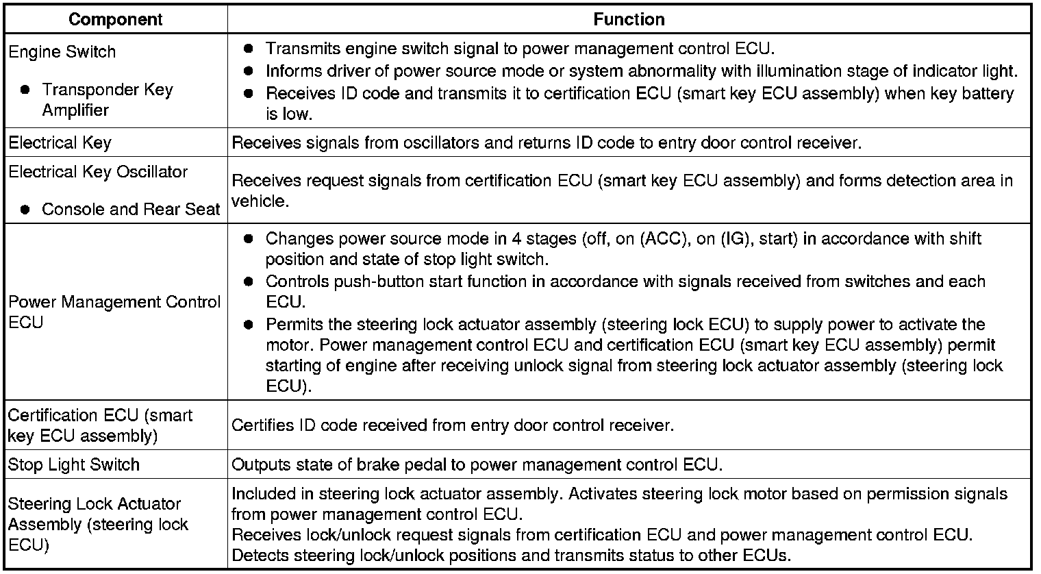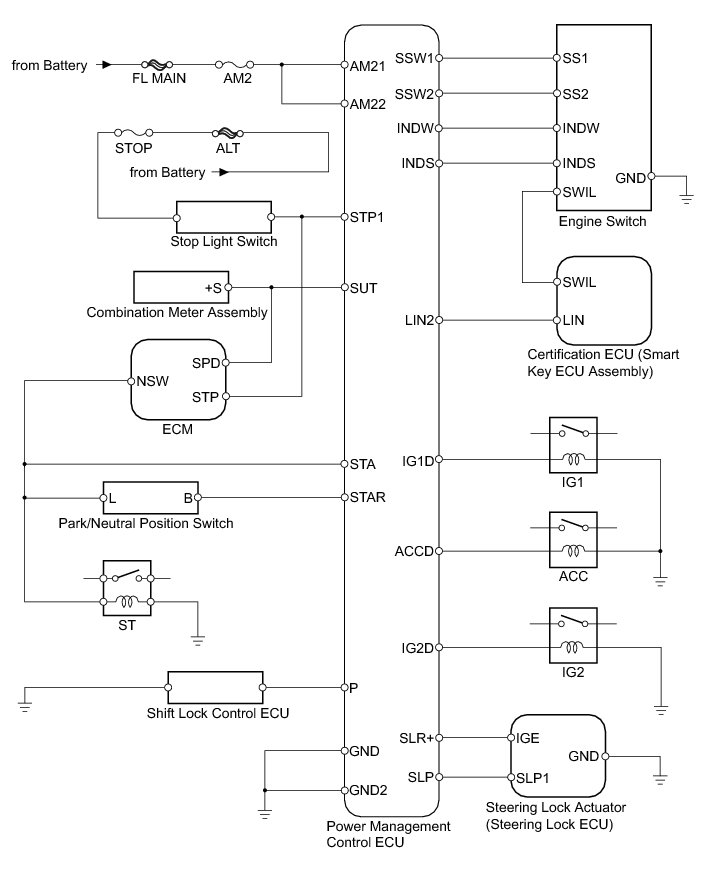 (a) The push-button start uses a push-type engine switch, which the driver can operate by merely carrying the electrical key. This system consists primarily of the power management control ECU, engine switch, steering lock ECU, electrical key, ACC relay, IG1 relay, IG2 relay and certification ECU (smart key ECU assembly). The power management control ECU controls the system. This function operates in cooperation with the smart key system.