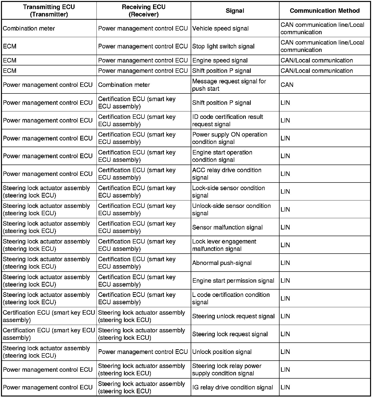 (b) The power management control ECU transmits a key verification request signal to the certification ECU (smart key ECU assembly) when it receives the stop light switch signal.