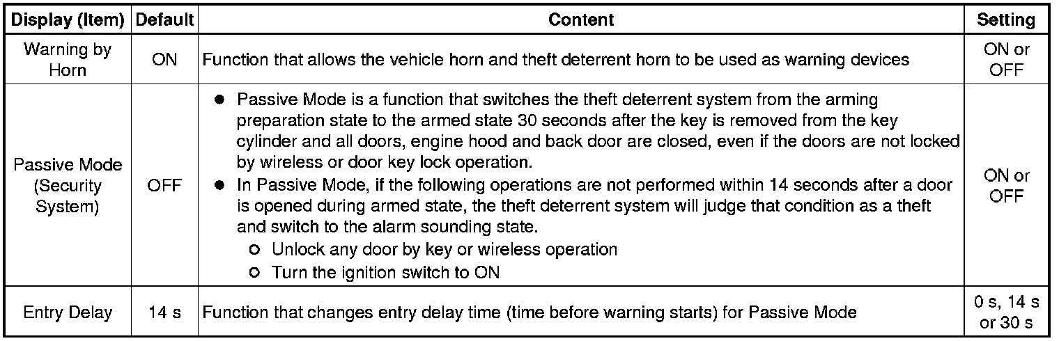 THEFT DETERRENT / KEYLESS ENTRY: THEFT DETERRENT SYSTEM (w/o Smart Key System): CUSTOMIZE PARAMETERS