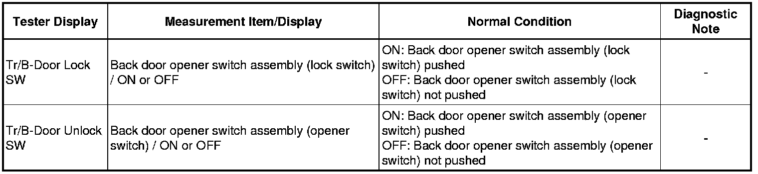 When the back door entry lock and unlock functions do not operate, one of the following may be malfunctioning: 1) power door lock control system; 2) outside electrical key oscillator (for rear side); 3) certification ECU (smart key ECU assembly), or 4) back door opener switch assembly.