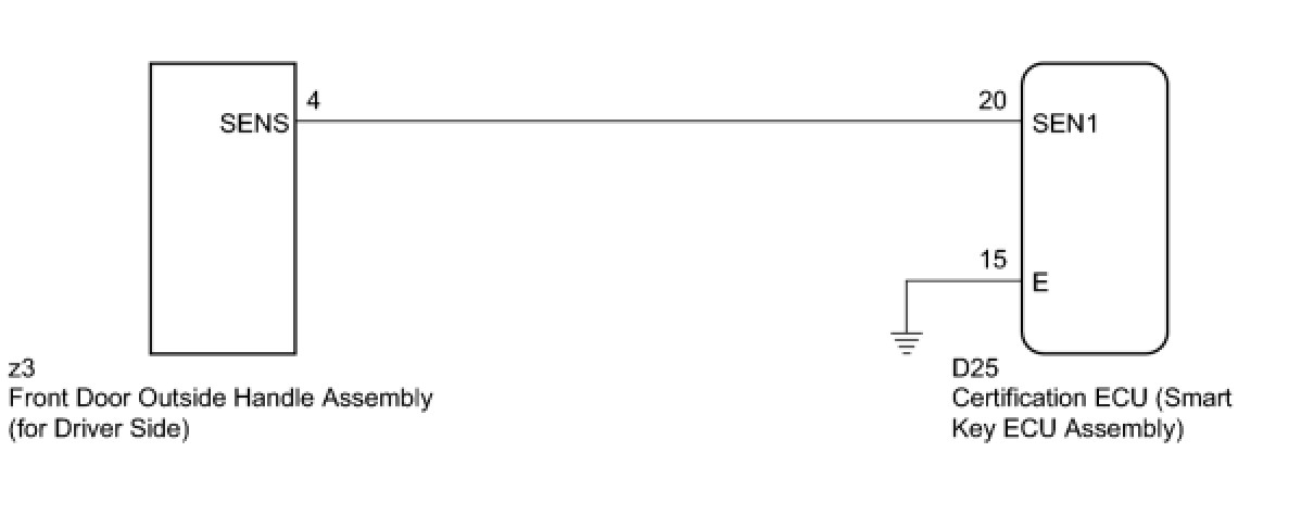 If the driver door entry lock function operates normally, but its entry unlock function does not, this means that the request code from the driver door is being output normally. In this case, a malfunction in the touch sensor circuit (from the certification ECU (smart key ECU assembly) to the front door outside handle assembly (touch sensor)) is suspected.