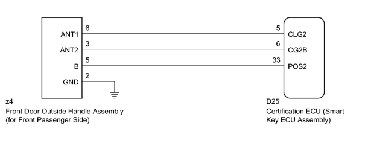 When the entry lock and unlock functions do not operate only for the front passenger door, an error in output request codes from the front passenger door or malfunction in the front door outside handle assembly is suspected. If the entry functions for the other doors operate normally, then the communication circuit between the key and door control receiver assembly is functioning normally. In this case, radio wave interference or a malfunction in the request code sending circuit (from the certification ECU (smart key ECU assembly) to the front door outside handle assembly (for driver side)) is suspected.