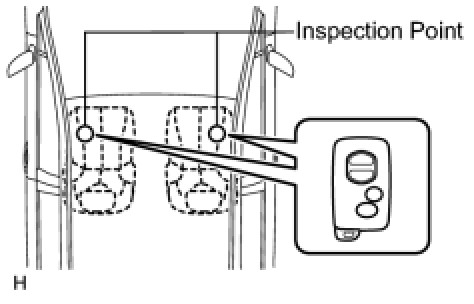 (a) Inspect the detection area for the entry ignition function (for rear floor). Make sure that the direction of the key is as shown in the illustration. When the key is in either of the 2 inspection points shown in the illustration, check that the engine can start.