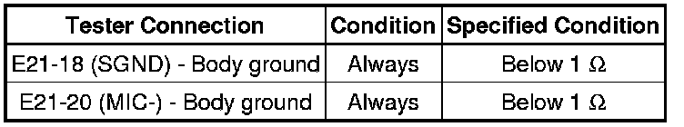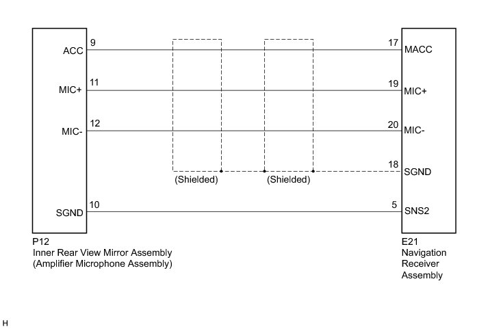 This circuit sends a microphone voice signal from the inner rear view mirror assembly (amplifier microphone assembly) to the navigation receiver assembly.