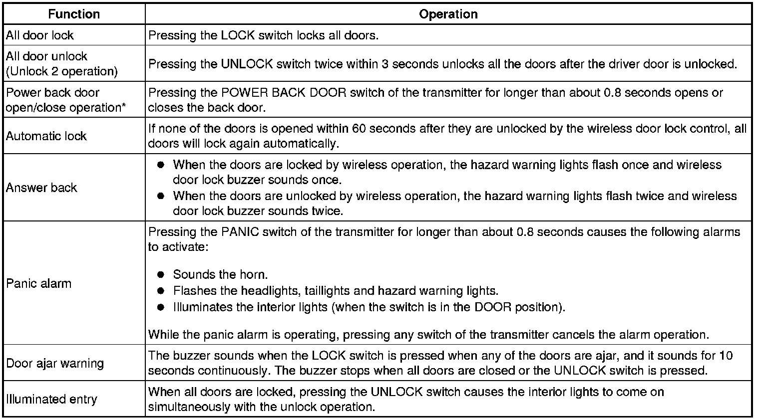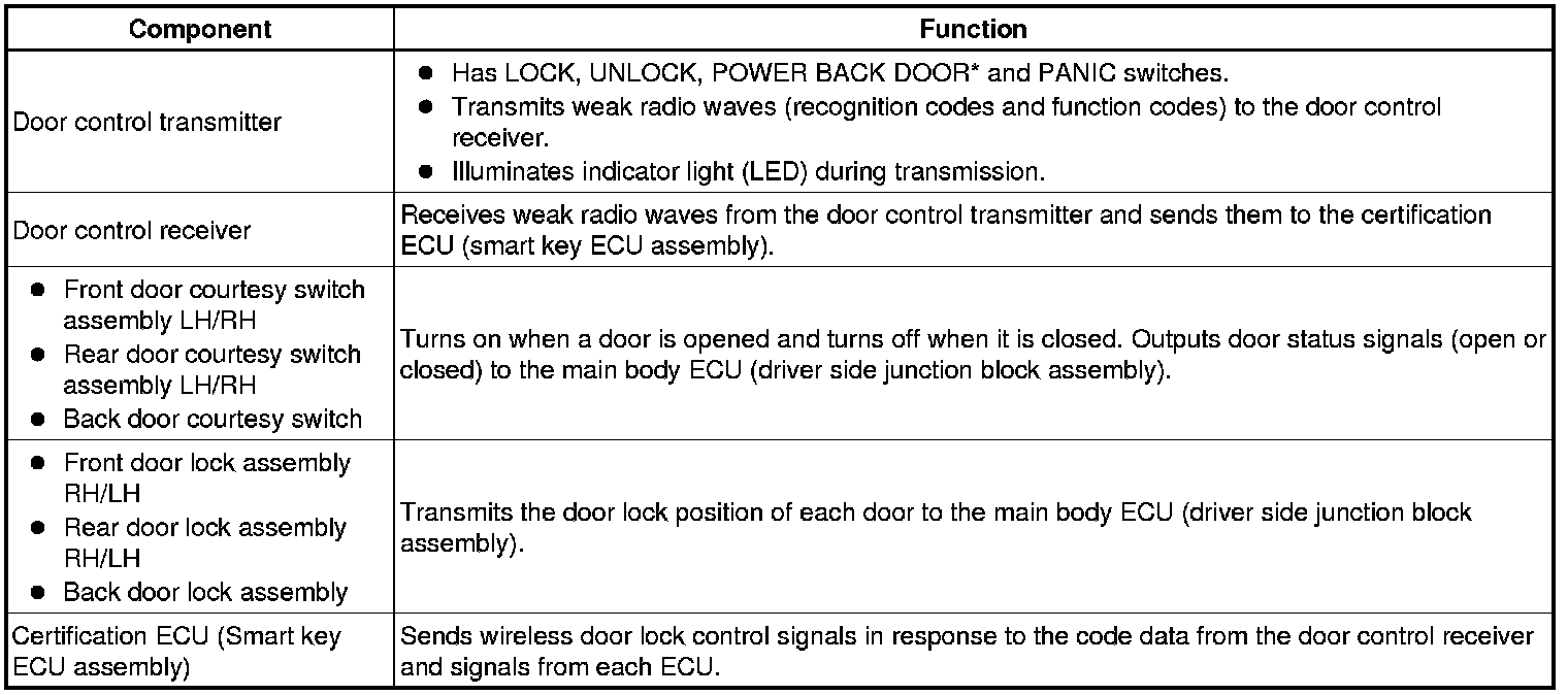 The door control transmitter has the LOCK, UNLOCK, POWER BACK DOOR* and PANIC switches. Operating these switches activates each function.
