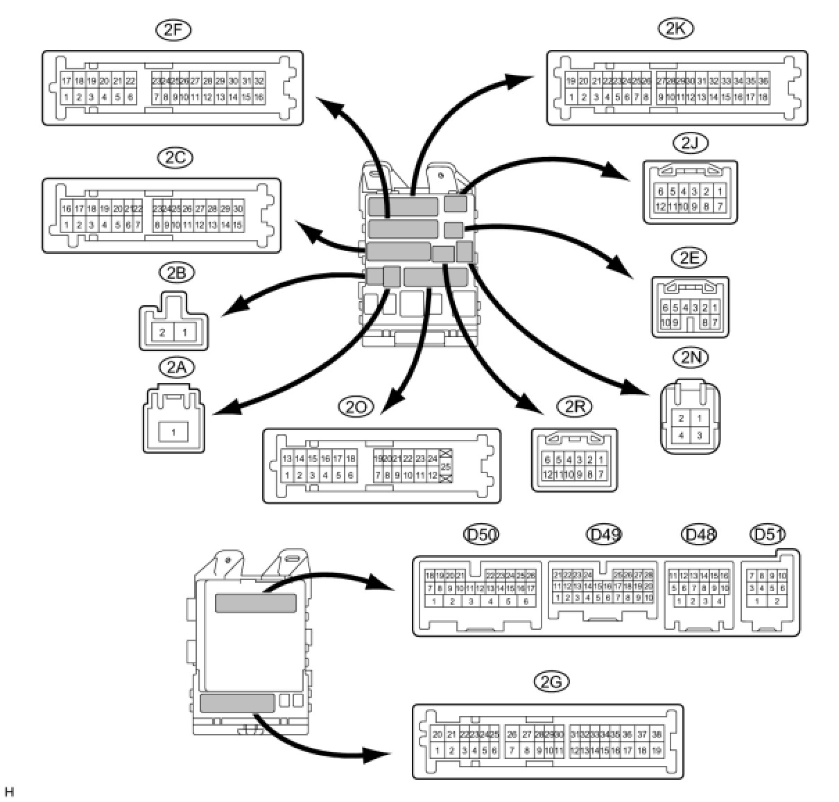 (c) Reconnect the 2A, 2C and 2F main body ECU (driver side junction block assembly) connectors.
