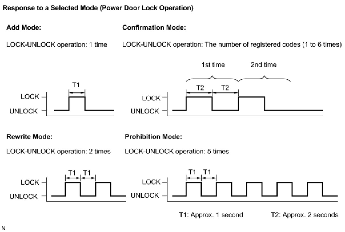 (5) After selecting a mode, the main body ECU (driver side junction block assembly) automatically performs the power door LOCK- UNLOCK operation within 5 seconds to inform the selected mode (see the illustration).