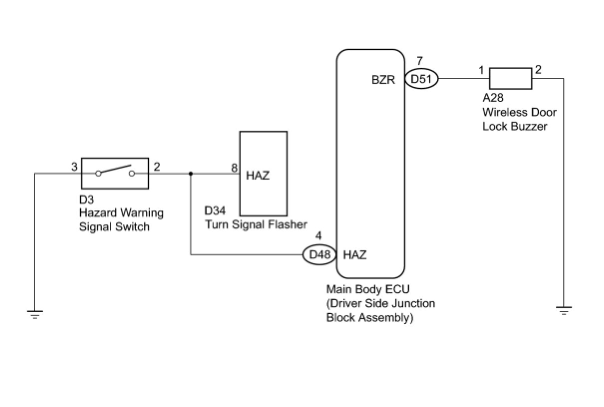 In some cases, wireless door lock control functions are normal but the hazard warning light and/or wireless door lock buzzer answer-back function(s) does not operate. In such cases, the main body ECU (driver side junction block assembly) hazard warning light and wireless door lock buzzer signal outputs may be malfunctioning.