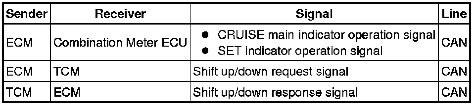 * The ECM receives signals such as ON-OFF, - SET, + RES, and CANCEL from the cruise control main switch and executes the command.
