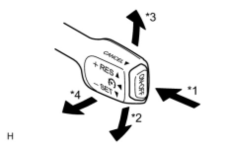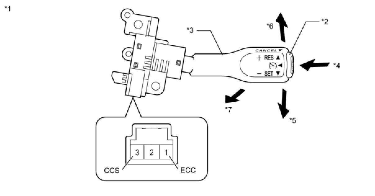 The cruise control main switch operates 7 functions: SET, -, TAP-DOWN, RES, +, TAP-UP, and CANCEL. The SET, TAP-DOWN, and - functions, and the RES, TAP-UP, and + functions are operated with the same switch. The cruise control main switch is an automatic return type switch which turns on only while it is being operated in the direction of each arrow and turns off after being released. The internal contact point of the cruise control main switch is turned on with the switch operation. Then the ECM reads the voltage value that has been changed by the switch operation to control SET, -, RES, +, and CANCEL.