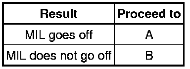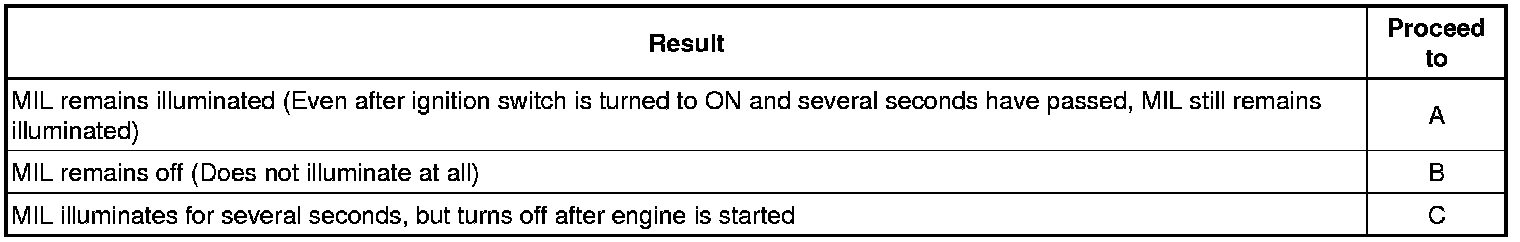 The MIL operation can be checked visually. When the ignition switch is first turned to ON, the MIL should be illuminated and should then turn off. If the MIL remains illuminated or is not illuminated, conduct the following troubleshooting procedure. If the ECM detects any trouble, the MIL illuminates. At this time, the ECM records a DTC in the memory.