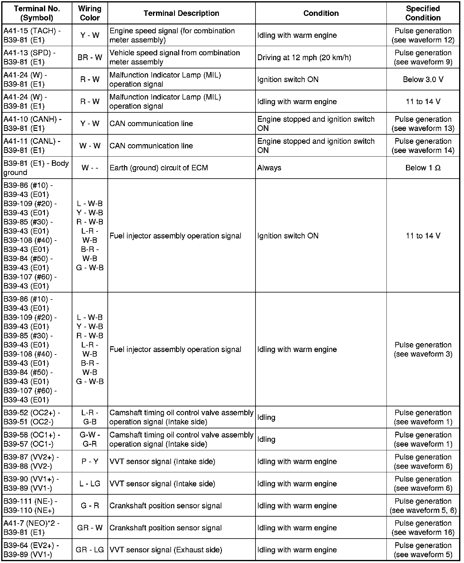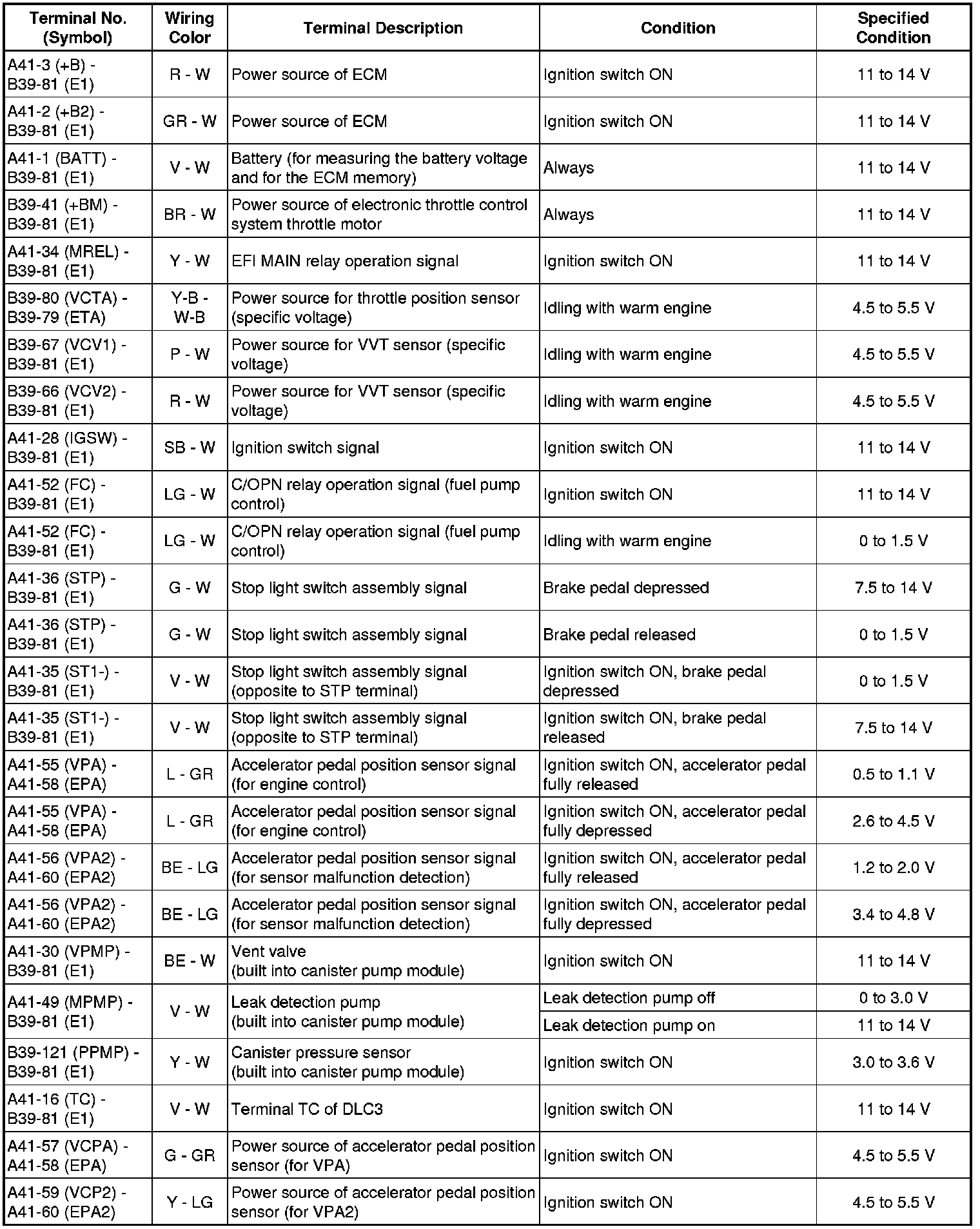 The standard normal voltage between each pair of the ECM terminals is shown in the table below. The appropriate conditions for checking each pair of the terminals are also indicated.