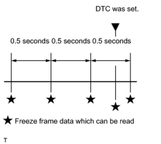 * The ECM records engine conditions in the form of freeze frame data every 0.5 seconds. Using the Techstream, 5 separate sets of freeze frame data, including the data values at the time when the DTC was set, can be checked.