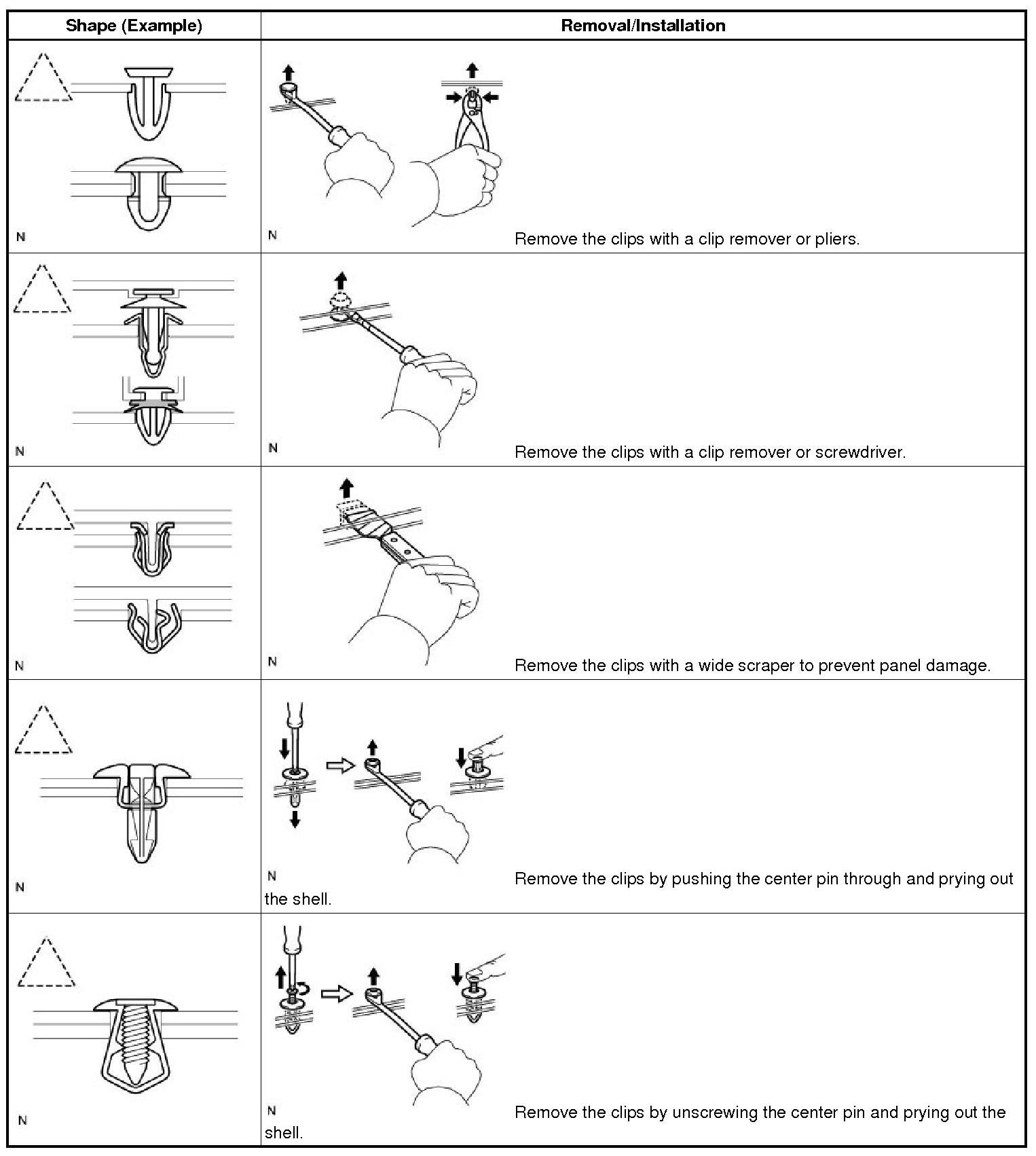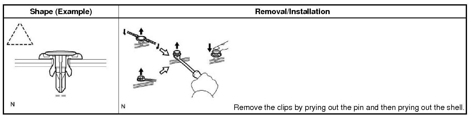 (1) The removal and installation methods of typical clips used for vehicle body parts are shown in the table below.