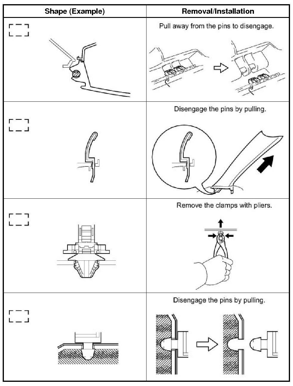 (1) The removal and installation methods of typical claws used for vehicle body parts are shown in the table below.