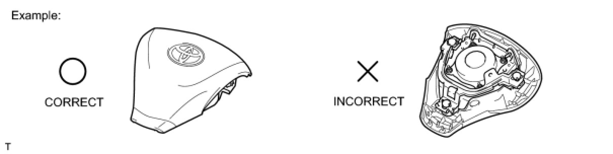 (1) Always place a removed or new steering pad with the surface facing upward as shown in the illustration. Placing the steering pad with the pad surface facing downward could cause a serious accident if the airbag deploys. Also, do not place anything on top of the steering pad.