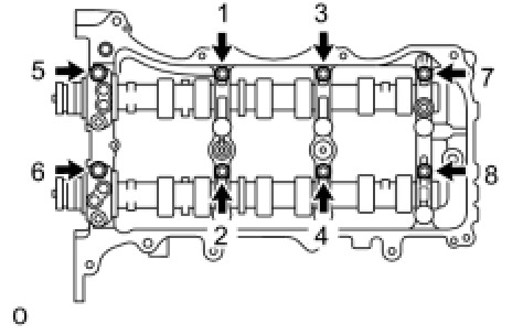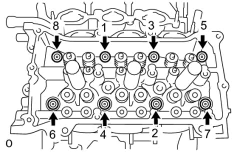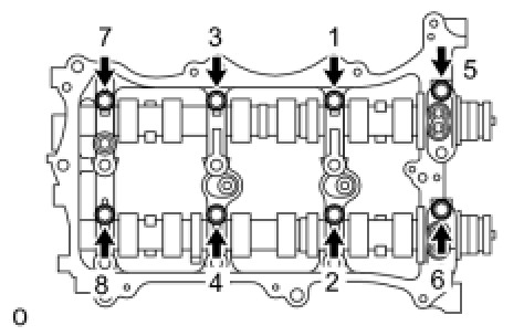 Temporarily tighten the 8 bearing cap bolts in the order shown in the illustration.
