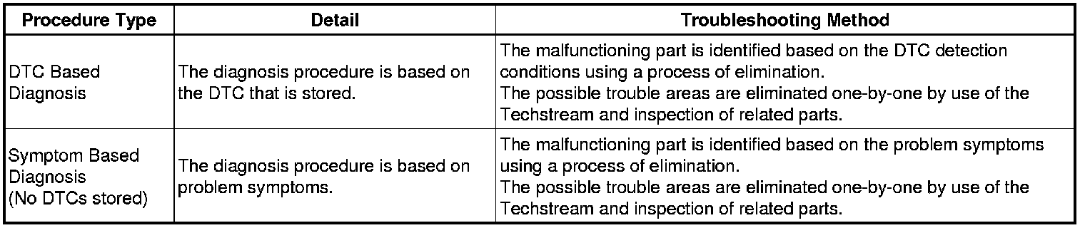 * The troubleshooting procedures consist of diagnosis procedures for when a DTC is stored and diagnosis procedures for when no DTC is stored. The basic idea is explained in the following table.