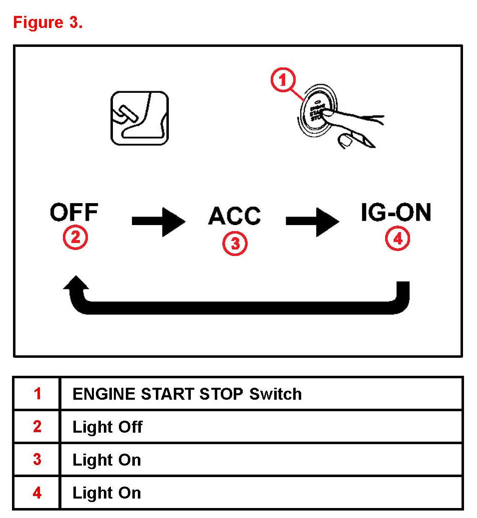 (2) Without depressing the brake pedal, press the "ENGINE START STOP" switch and confirm the mode changes properly.