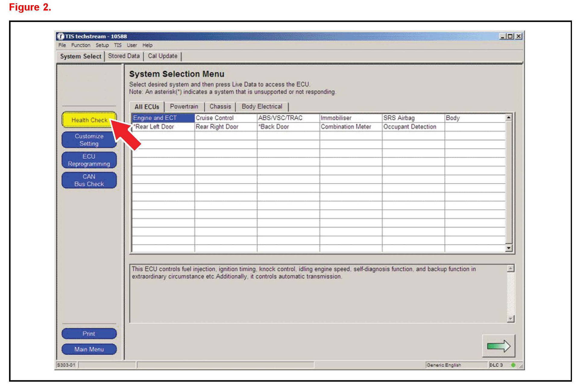 1. Verify the vehicle's applicability for recalibration and locate desired calibration file by performing the Techstream Health Check function.