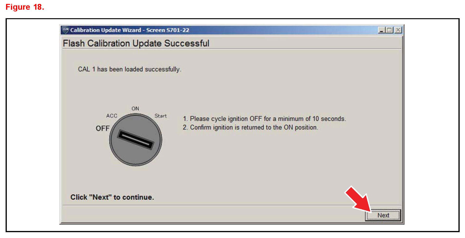 J. When Cal 1 has completed the update process turn ignition OFF for a minimum of 10 seconds. Then click "Next".