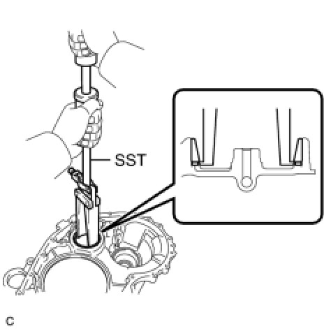 (a) Using SST, remove the counter driven gear front tapered roller bearing outer race and shim from the transaxle housing.
