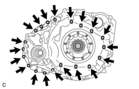 (b) Using a brass bar and hammer, tap on the circumference of the transaxle housing to remove the transaxle housing from the transaxle case.
