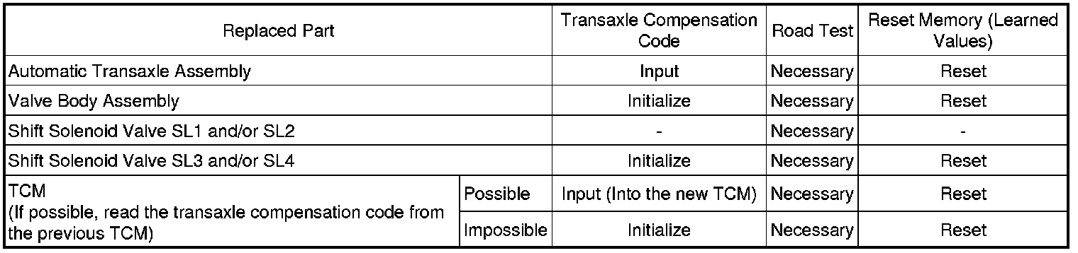 * If automatic transaxle parts are replaced, perform the following as necessary referring to the table below: