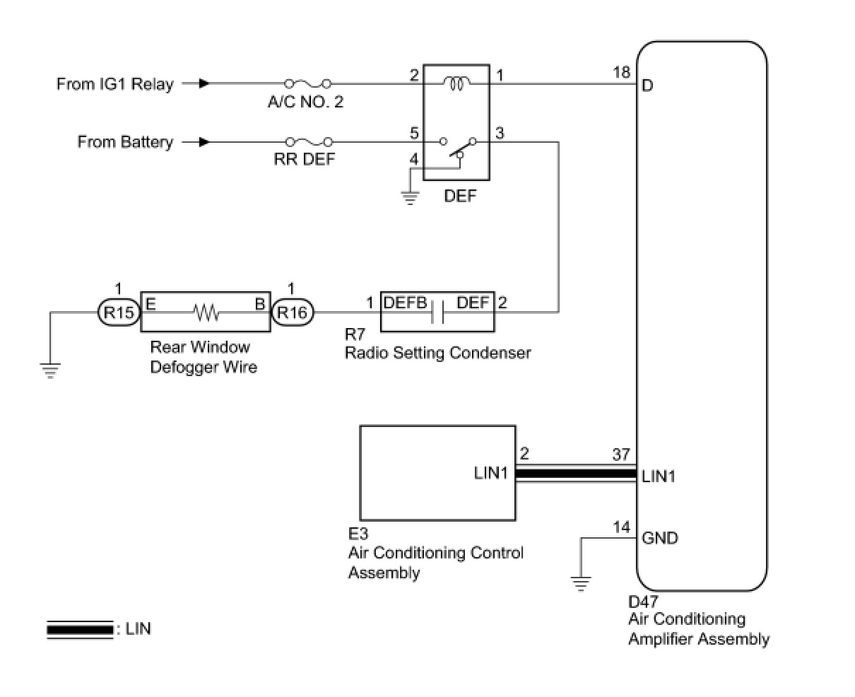When the rear window defogger switch on the air conditioning control assembly is pressed, the operation signal is transmitted to the air conditioning amplifier assembly through the LIN communication line. When the air conditioning amplifier assembly receives the signal, it turns on the DEF relay to operate the rear window defogger.