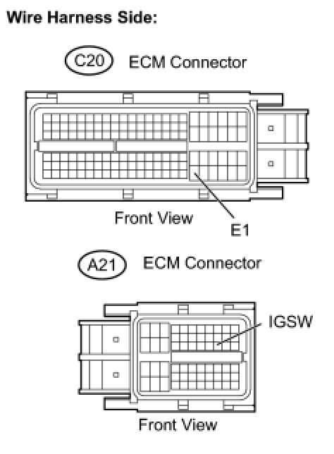 (c) Measure the voltage between the terminals of the C20 and A21 ECM connectors.
