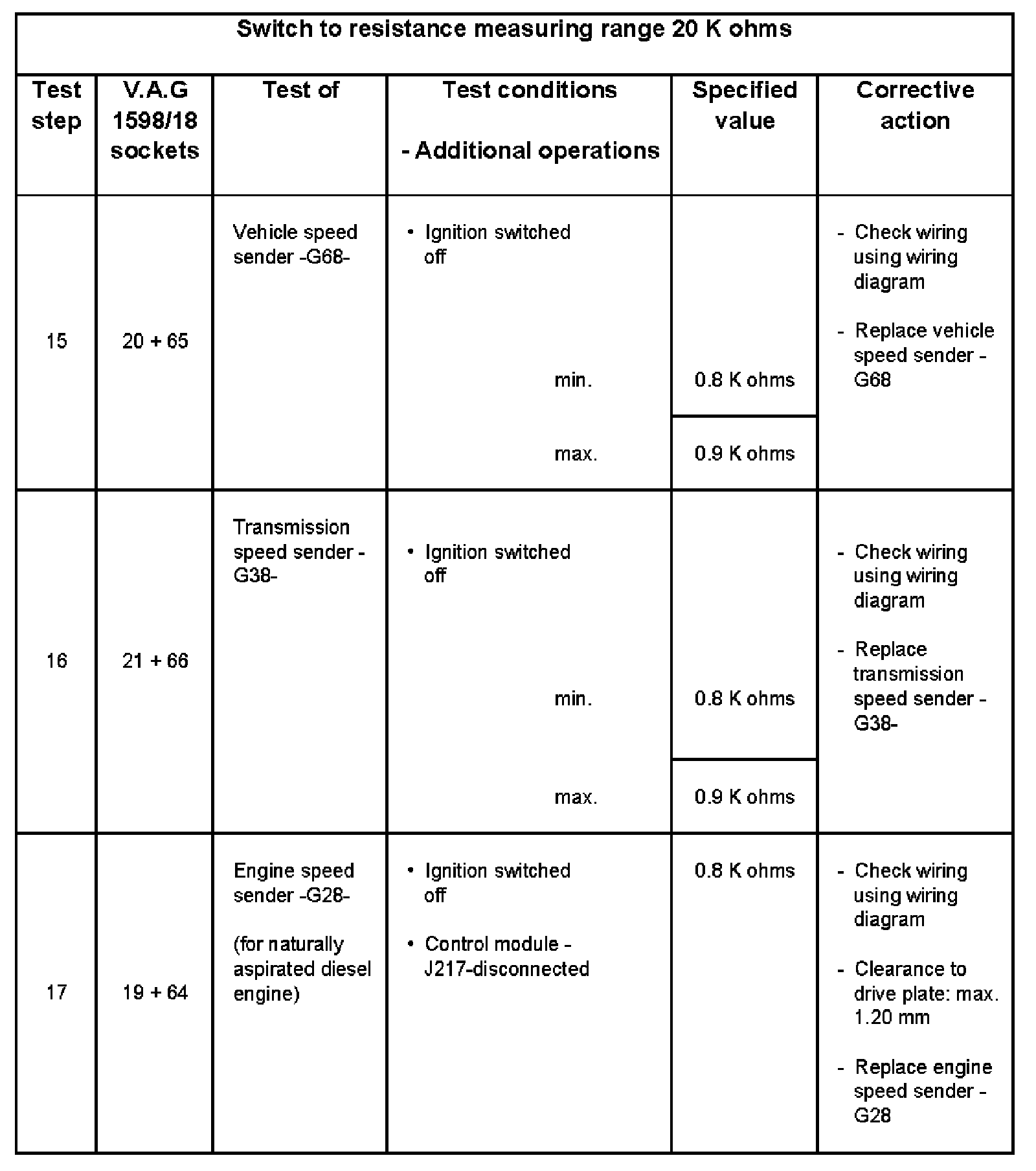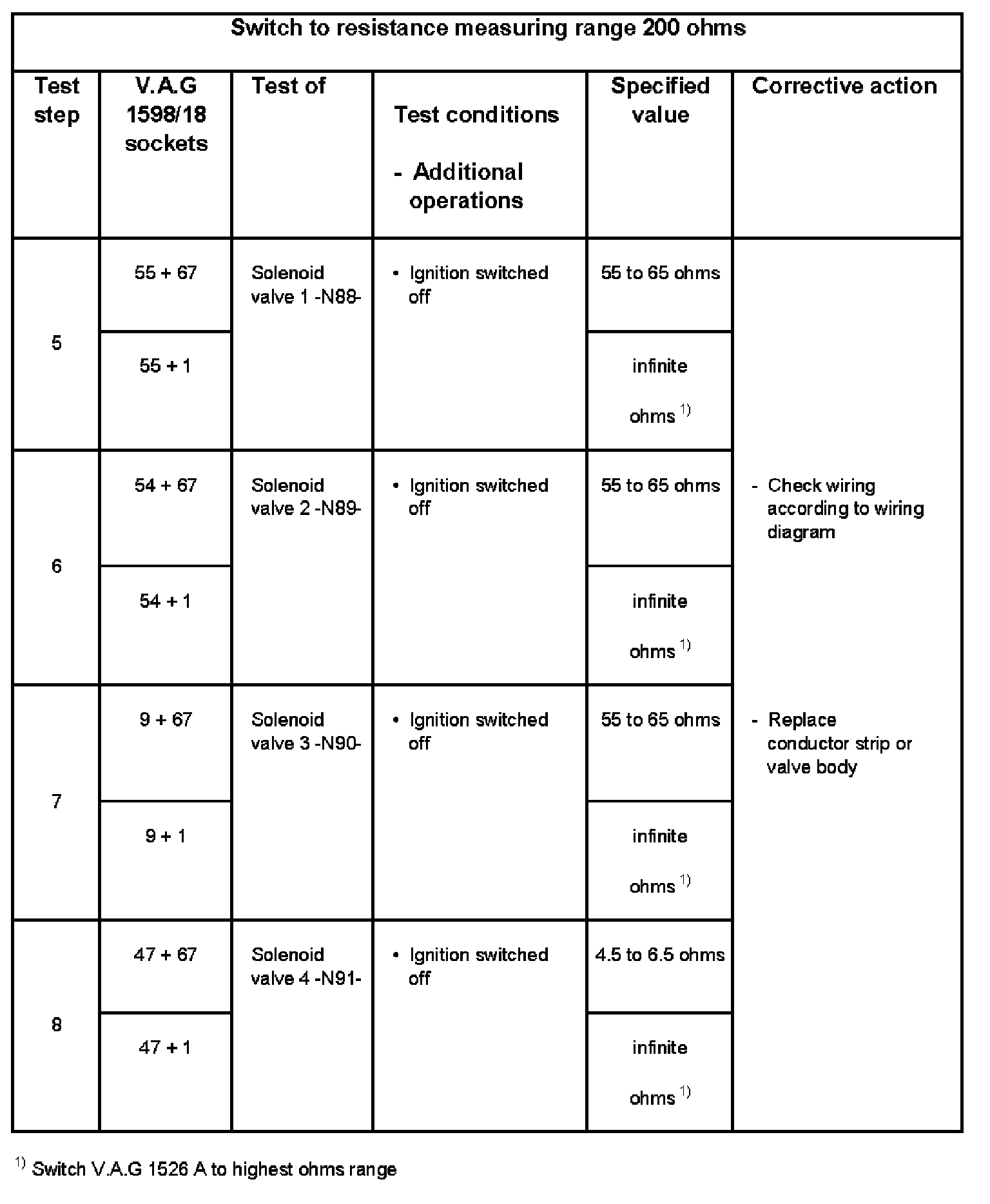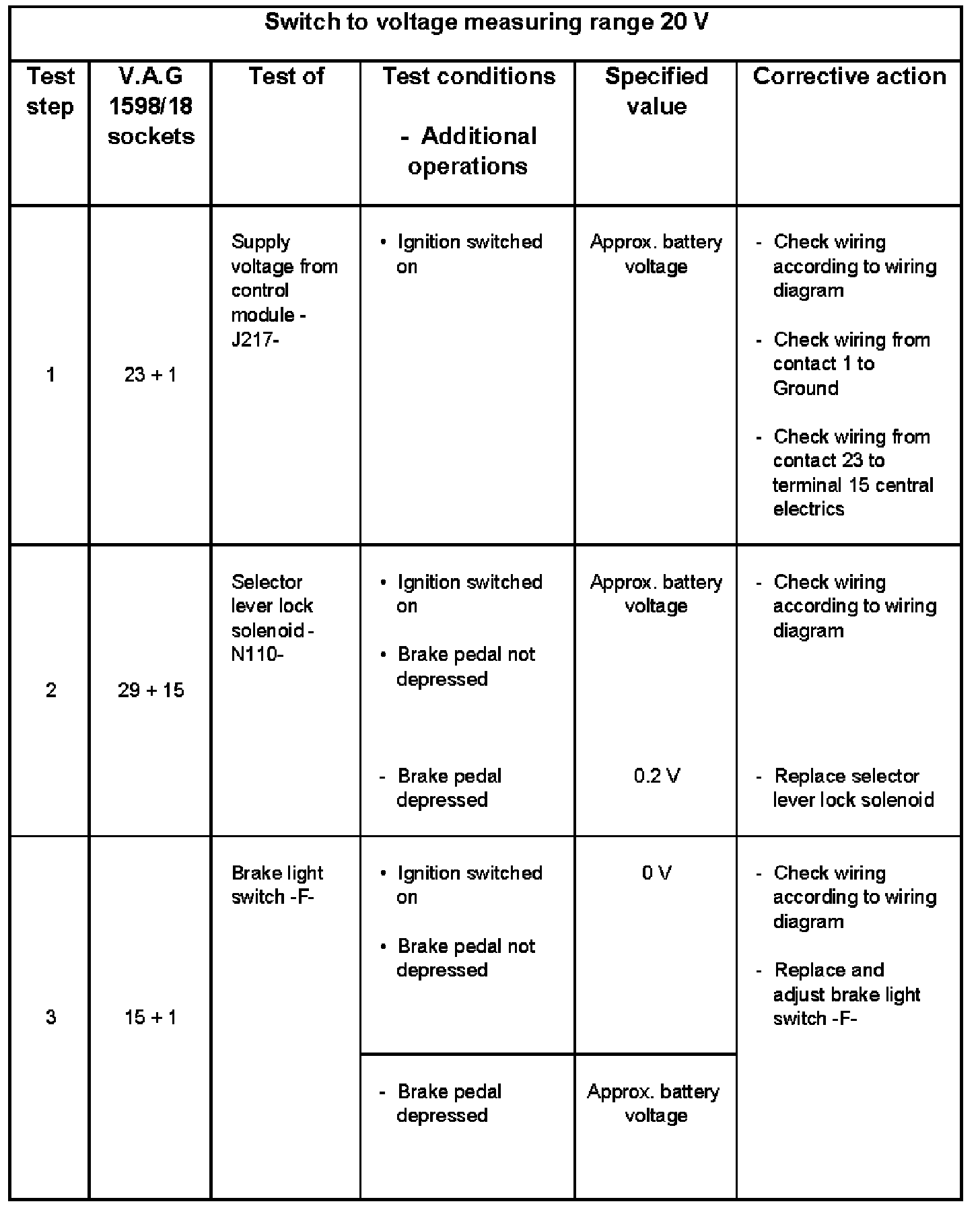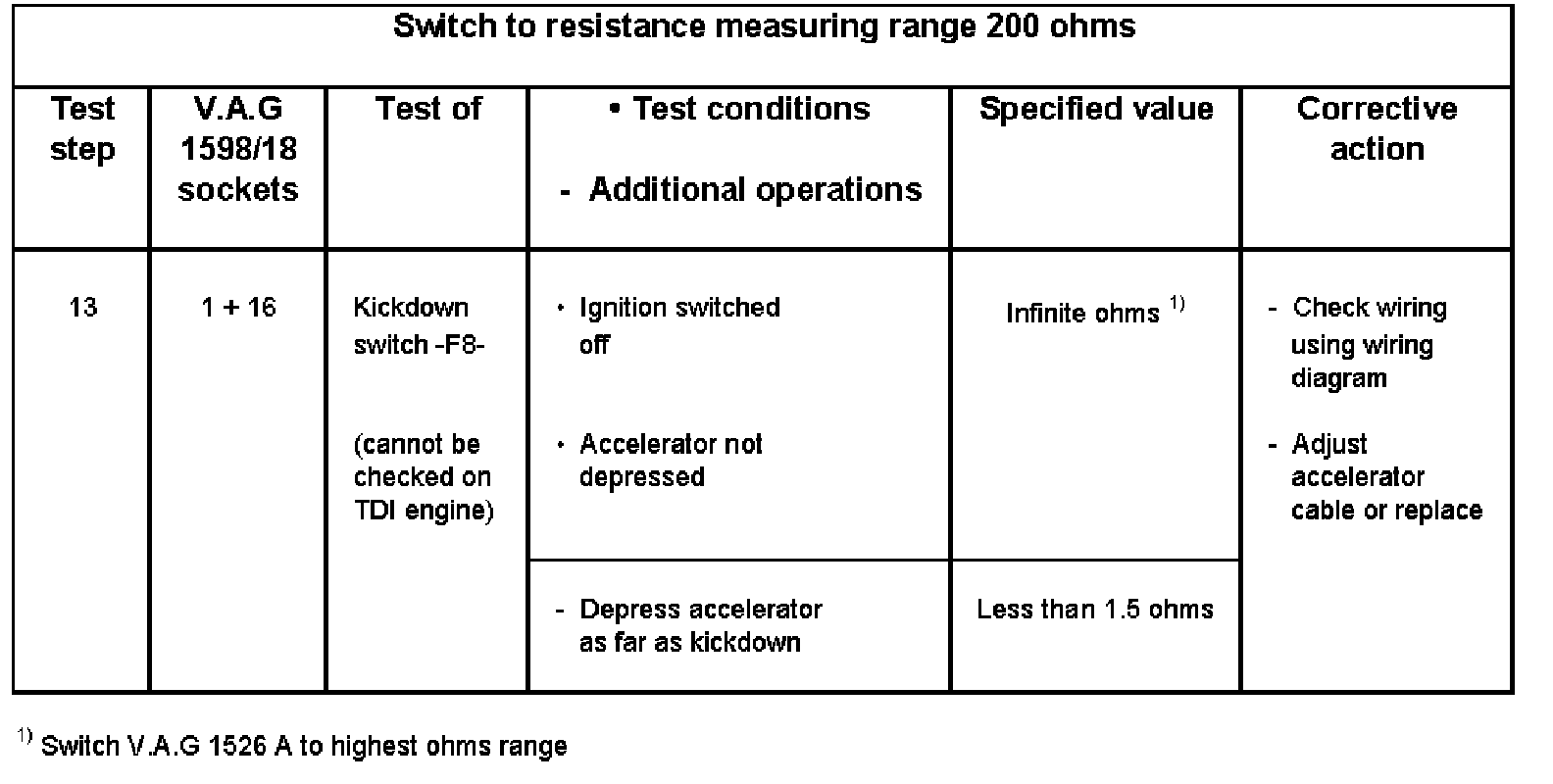 1) Voltage supply and signal (contacts 50, 28 + 5) not assigned on vehicles with 6-cylinder or TDI engine; signal (contact 41) is transmitted via engine control module to transmission control module and can only be checked in "Read measuring value block". Reading