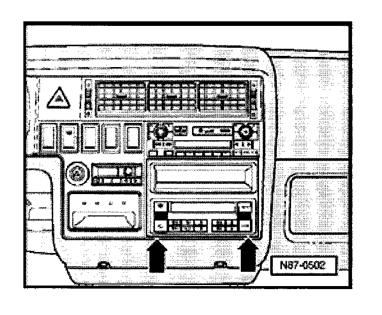 - Remove storage tray and carefully pry out control head trim at -arrows- with a screwdriver.