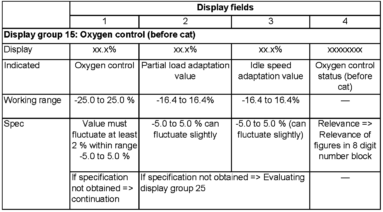 - Check Oxygen control Specifications (before cat). See Display fields 1 to 3