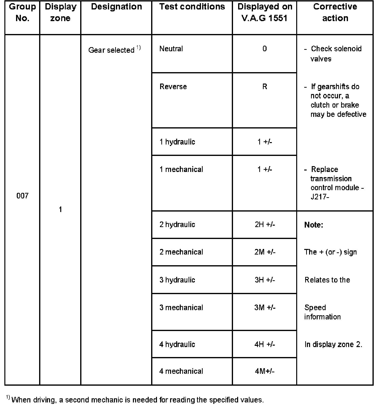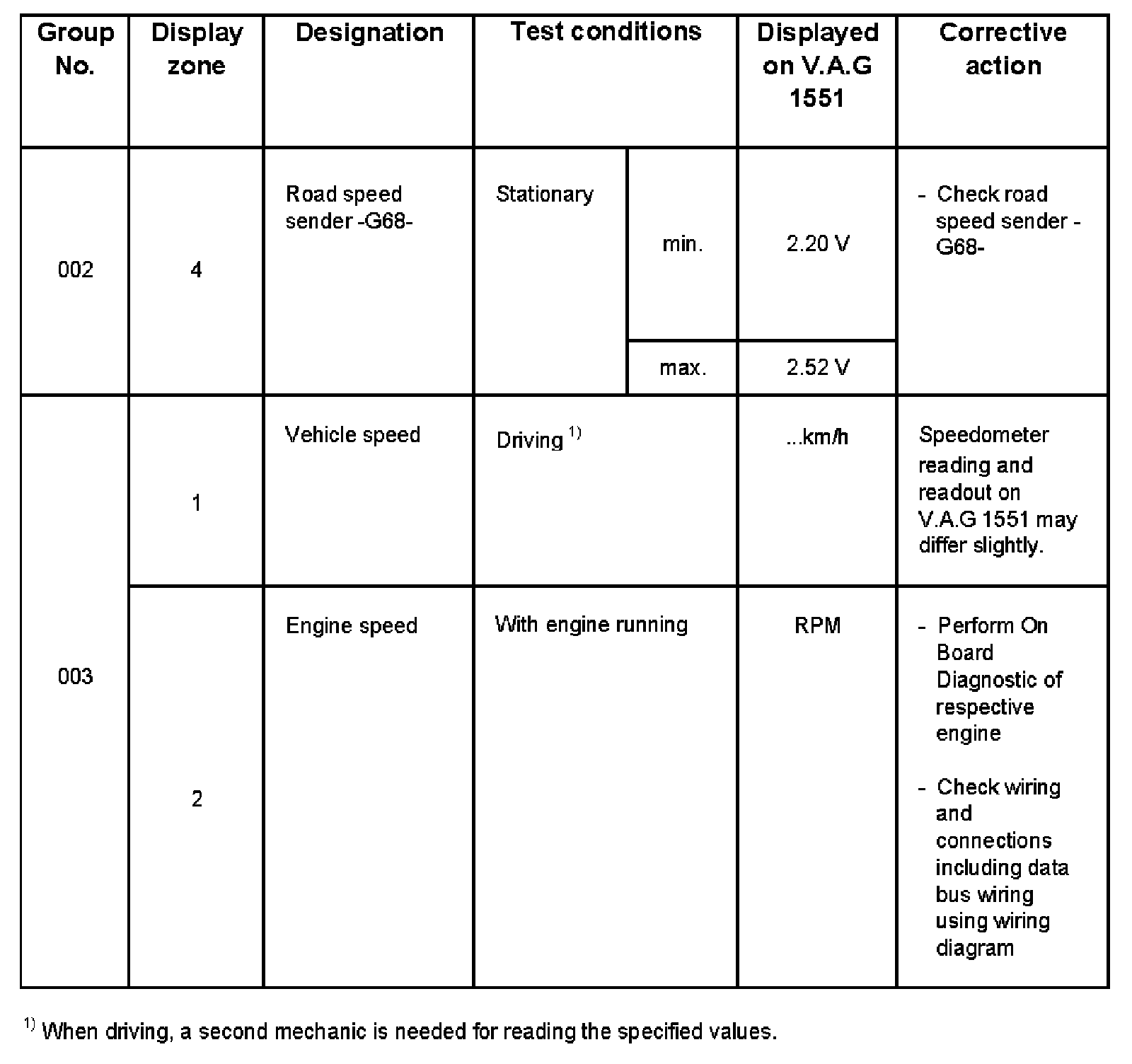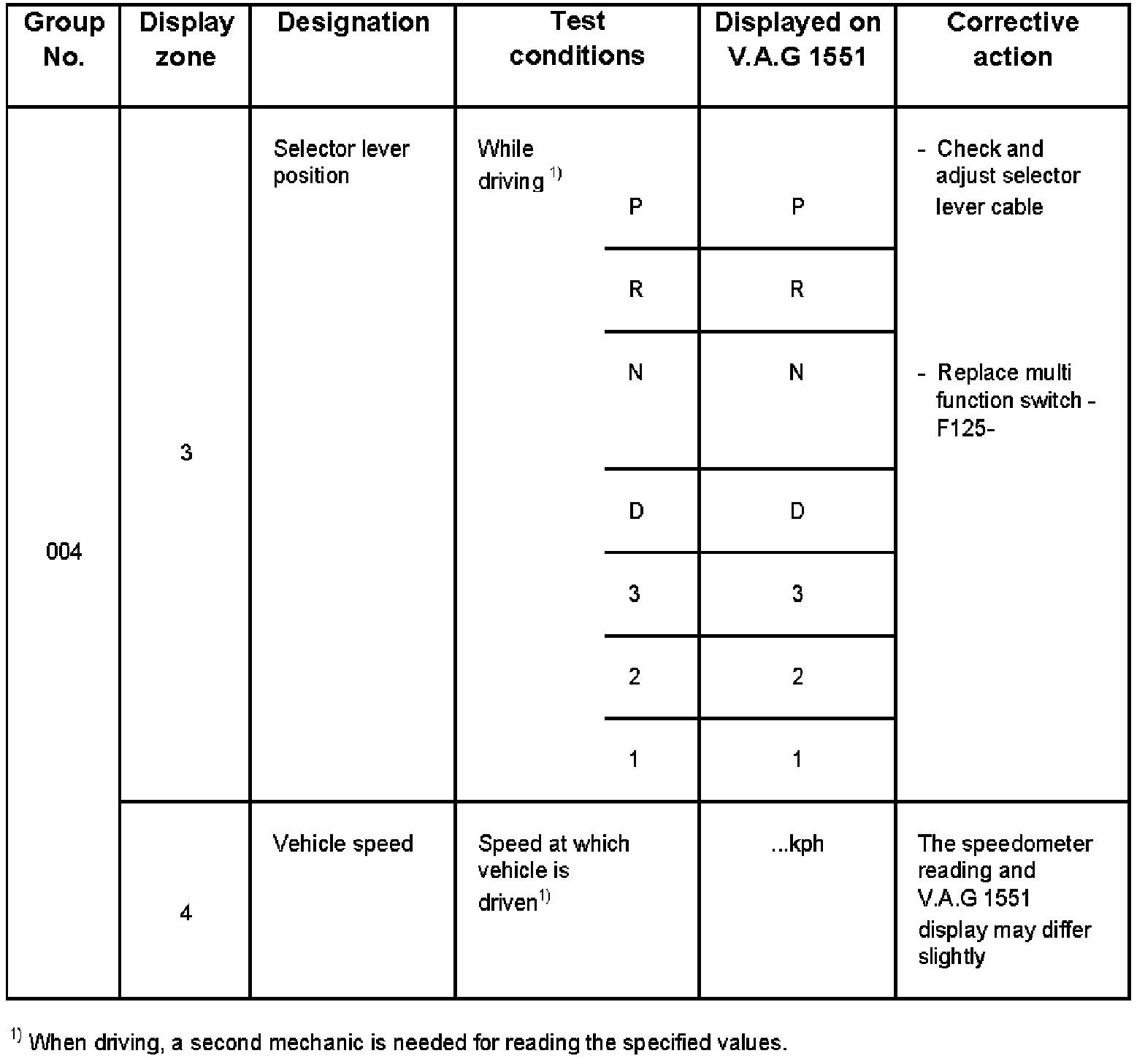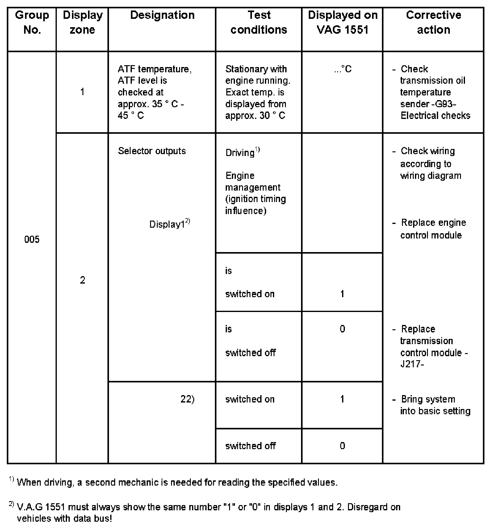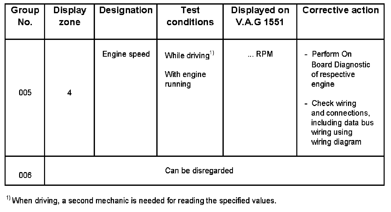 - V.A.G 1551 display zone 1 has 6 characters (0000 00) and is read as follows: