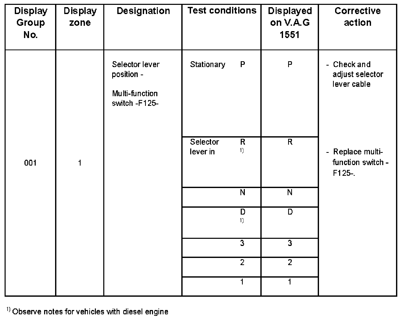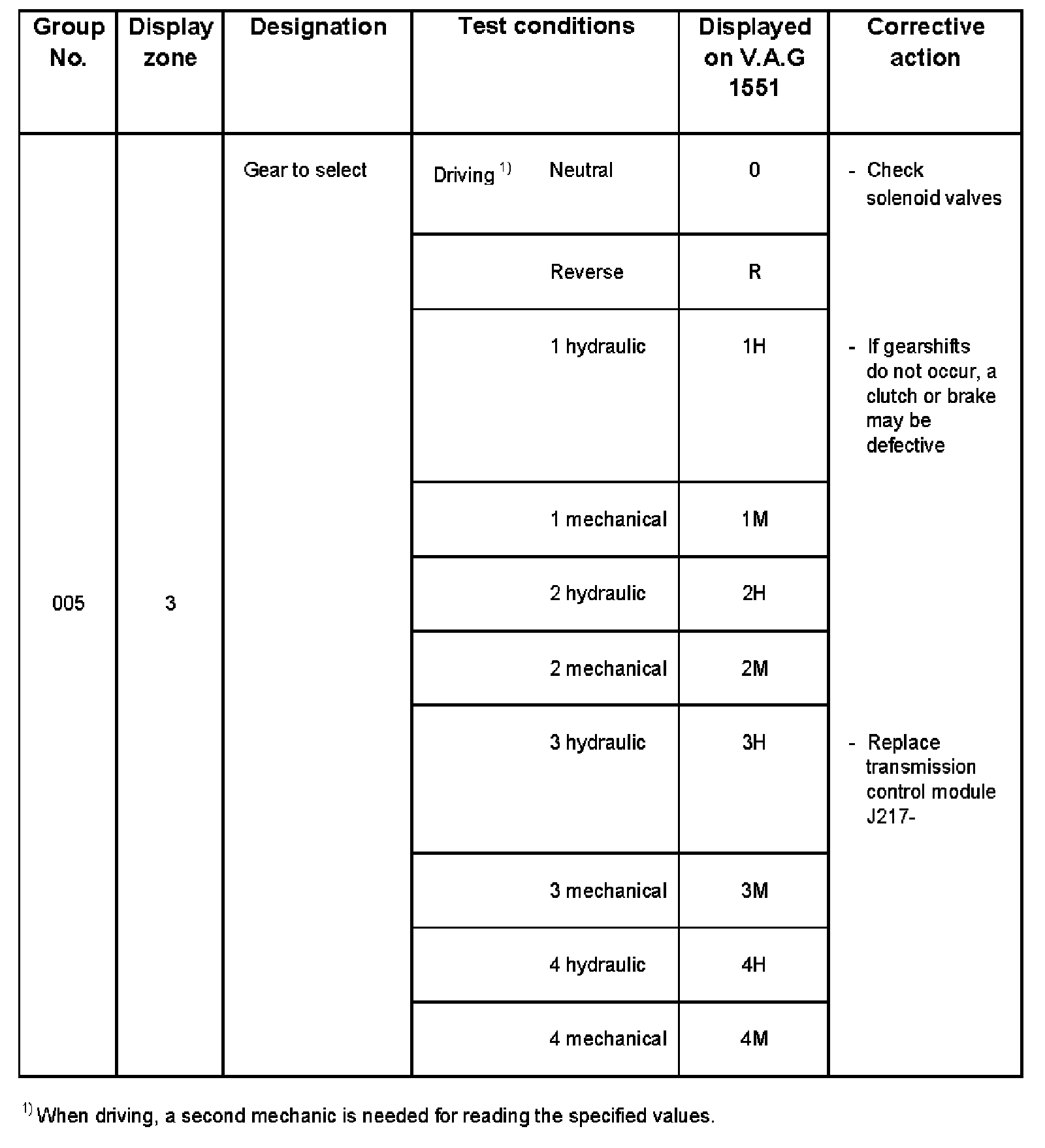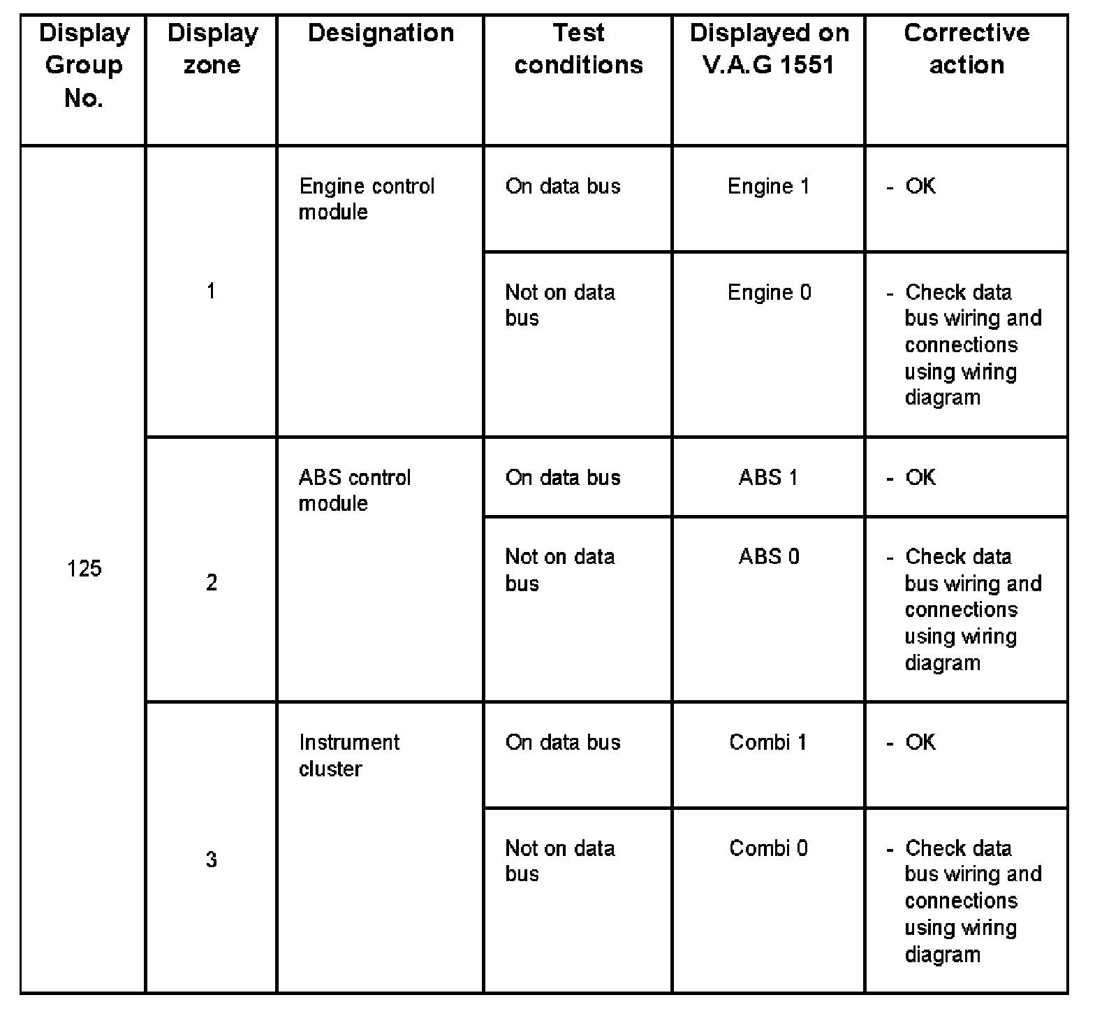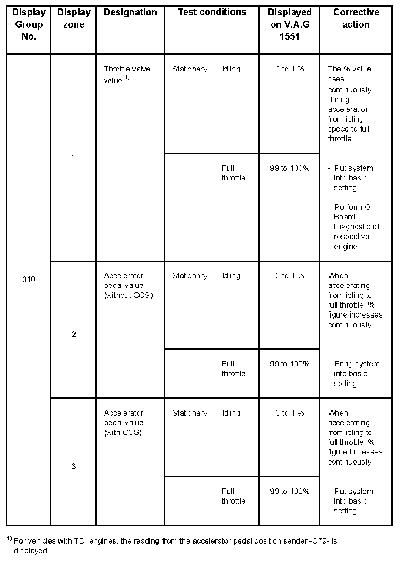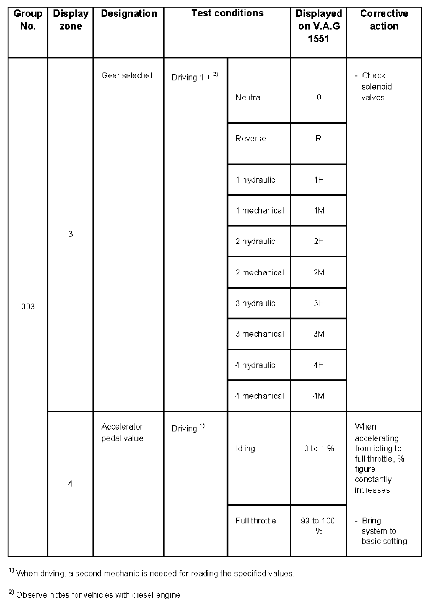 - V.A.G 1551 display zone 1 has 6 characters (0000 00) and is read as follows: