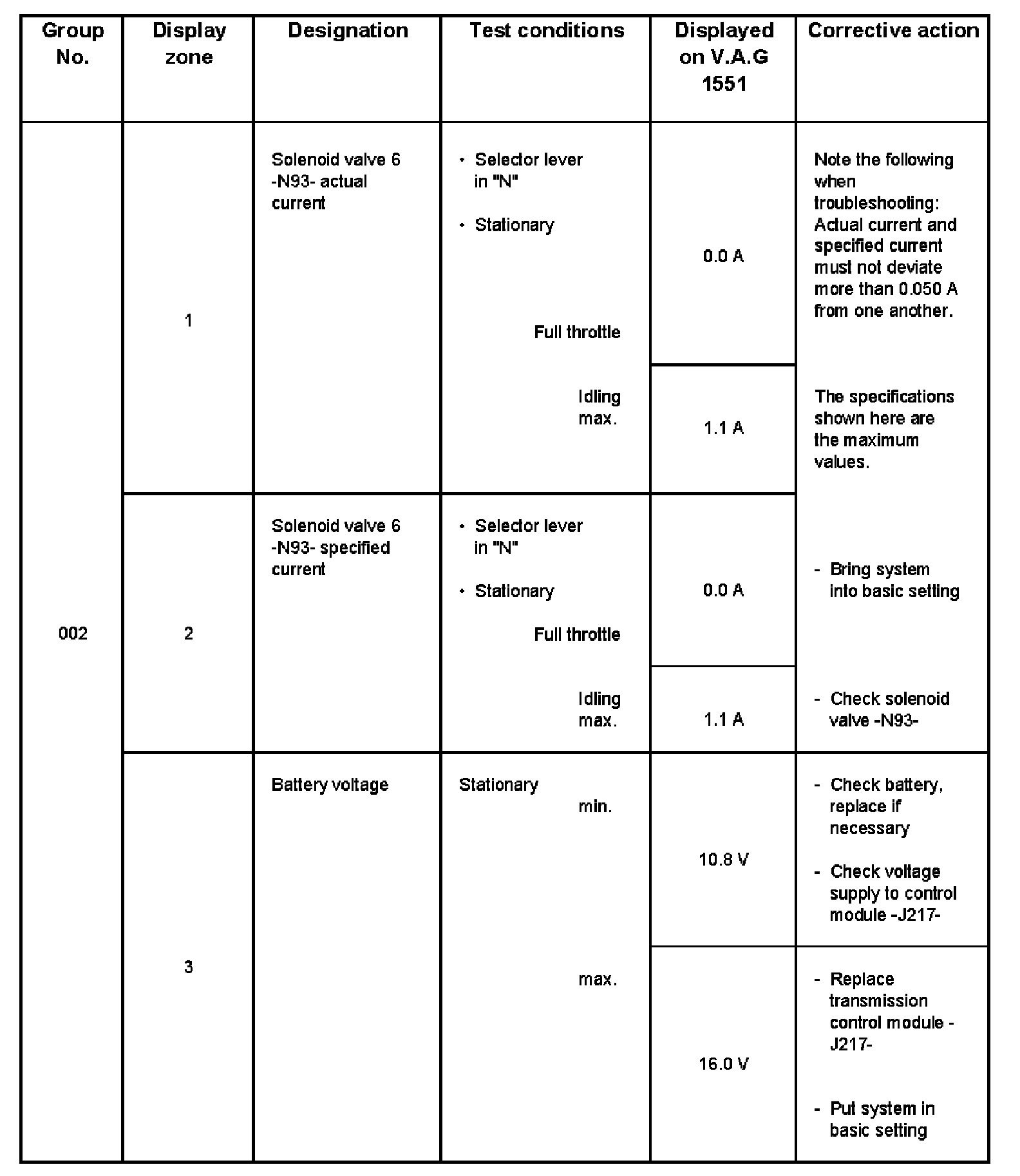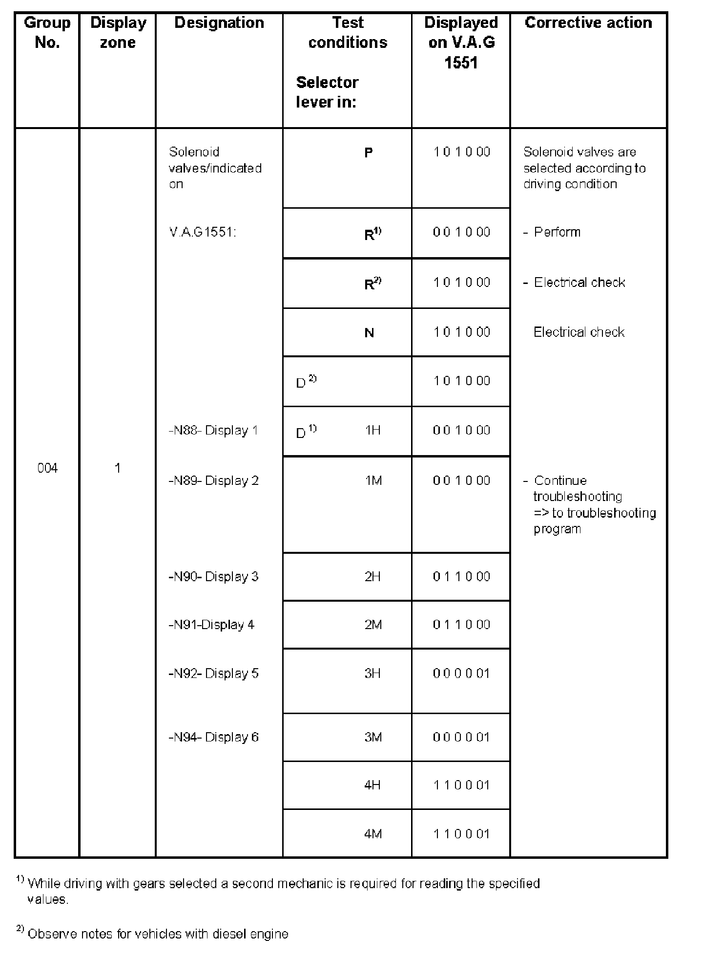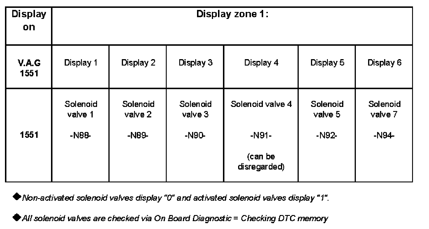 - The solenoid valves -N92- and -N94- are valves which ensure a smooth gear shift and are only activated during gear shifts and displayed in zones 5 and 6. They can show "0" or "1" depending on driving situation.