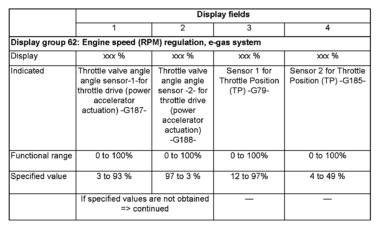 - The value indicated in display field 1 increases, but the value indicated in display field 2 decreases, because the potentiometers (angle sensors) in the throttle valve control module run in opposite directions.