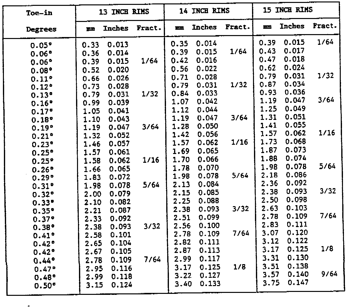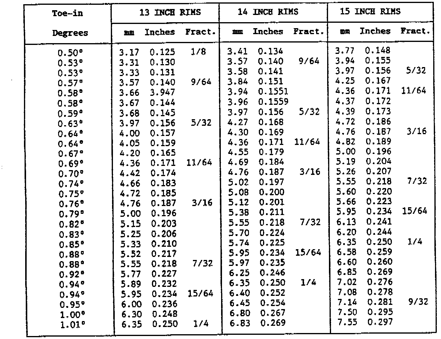 As a rule, Toe-in and Camber are given in angular degrees. Some alignment machines display figures for the Toe-in in fractions of an inch or decimal inches or in millimeters. The equivalent angular degrees can easily be obtained from the tables.