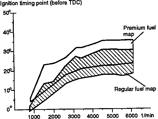 The ignition timing point is determined by the CIS-E Motronic control unit. Information on engine load, speed and coolant temperature are processed by the control unit and compared to programmed "Basic Ignition Maps" in the control unit's permanent memory. These three dimensional ignition performance maps are used to optimize the ignition to achieve the most favorable exhaust gas emissions, fuel consumption, and engine performance characteristics for any given load or speed condition.