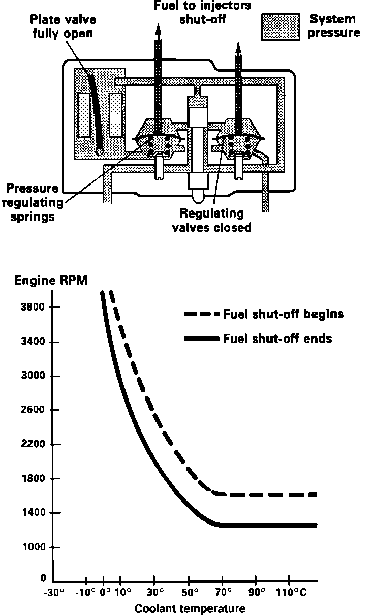 In order to accomplish smooth operation, the point at which fuel shut-off begins and ends, is depends on coolant temperature. If the engine has attained normal operating temperatures, fuel shut-off will occur when the engine speed is above approx. 1600 RPM and the throttle valve idle switch is closed. Current flow to the differential pressure regulator will return to normal when the engine speed drops below approx. 1300 RPM, restarting injection.